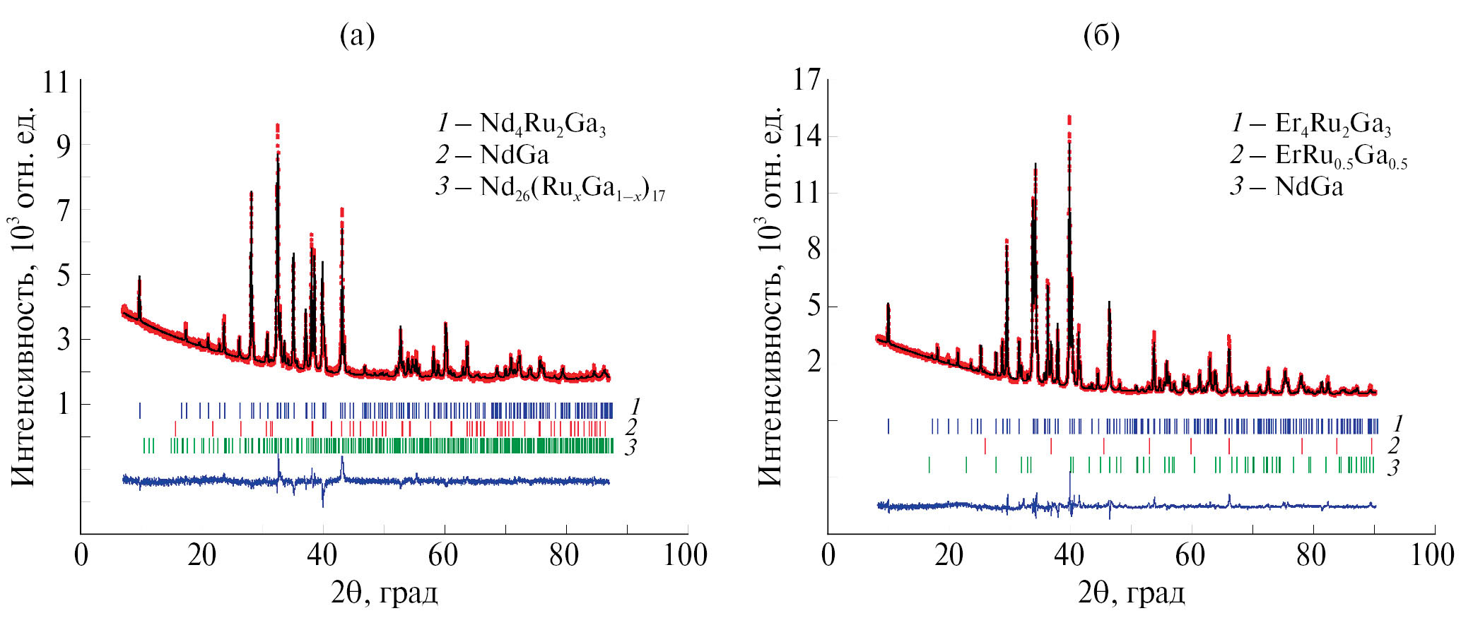 Рис. 1. Результат уточнения методом Ритвельда структур Nd4Ru2Ga3 (а) и Er4Ru2Ga3 (б) в присутствии следов примесей по дифрактограммам порошка: эксперимент (точки), теория (непрерывная линия), разностная кривая (нижняя линия). Вертикальными полосками обозначены углы Брэгга.