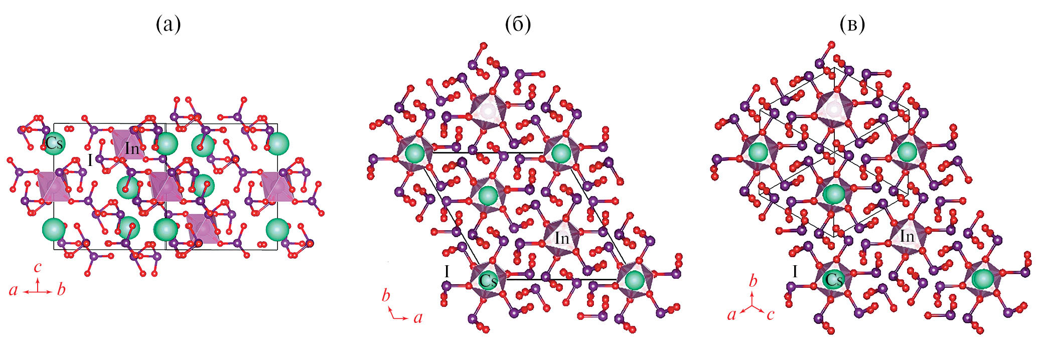 Проекции структур вдоль тройной оси для новой тригональной модификации Cs2HIn(IO3)6 (пр. гр. R) и вдоль псевдотройной оси для описанной ранее триклинной модификации (пр. гр. P) с псевдоромбоэдрической ячейкой практически совпадают (рис. 1б, 1в). Проблему электронейтральности формулы как в триклинной модификации, так и в рассматриваемом случае снимали, вводя атом H, предположительно, в позицию свободного центра инверсии.