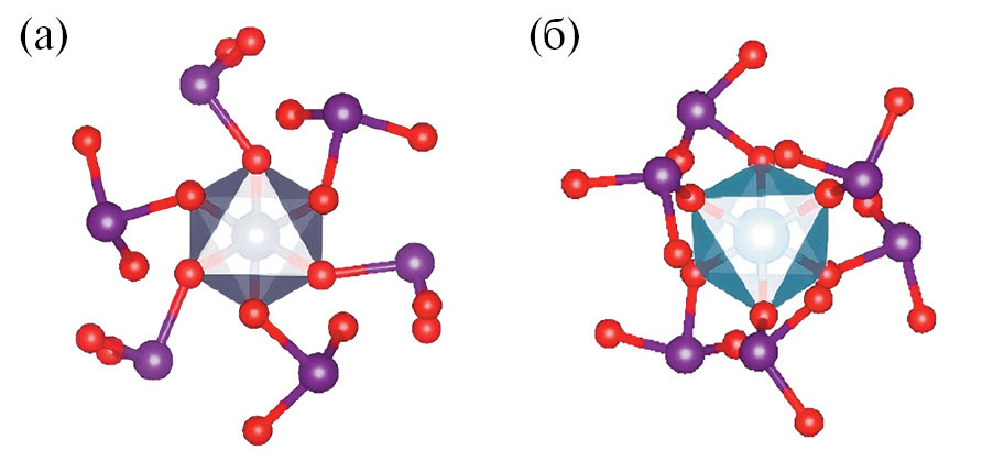 Рис. 3. Ацентричные блоки [M(IO3)6] (M = Ge, Ti) с точечной симметрией 3 в структурах водных иодатов BaGe(IO3)6 · H2O (а), BaTi(IO3)6 · 0.5H2O (б).