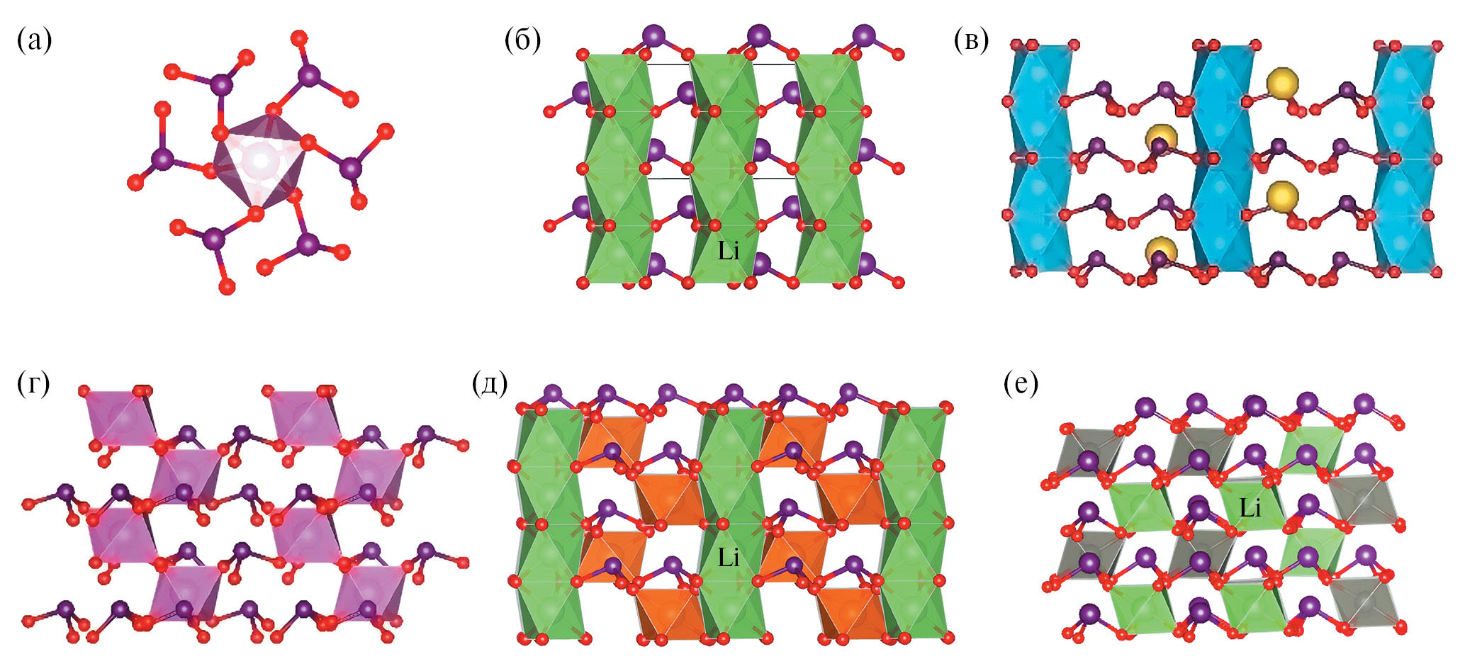Для LiZn(IO3)3 известна также другая полиморфная разновидность (пр. гр. P21), где блоки [Zn(IO3)6] и [Li(IO3)6] совместно формируют каркас, аналогичный структурам M(IO3)2 (M = Mg, Zn, Co, Ni, Cu2+, Mn2+), но с чередующимися блоками (рис. 6е). Каркас той же топологии, составленный из чередующихся блоков [Al(IO3)6] и [Li(IO3)6], наблюдается в структуре LiAl(IO3)4 (пр. гр. P21) [56], однако чередование блоков в структурах LiZn(IO3)3 и LiAl(IO3)4 различно. Все представленные выше иодаты с симметрией P63 и P21 обладают полярными структурами и в значительной степени проявляют нелинейно-оптические свойства.
