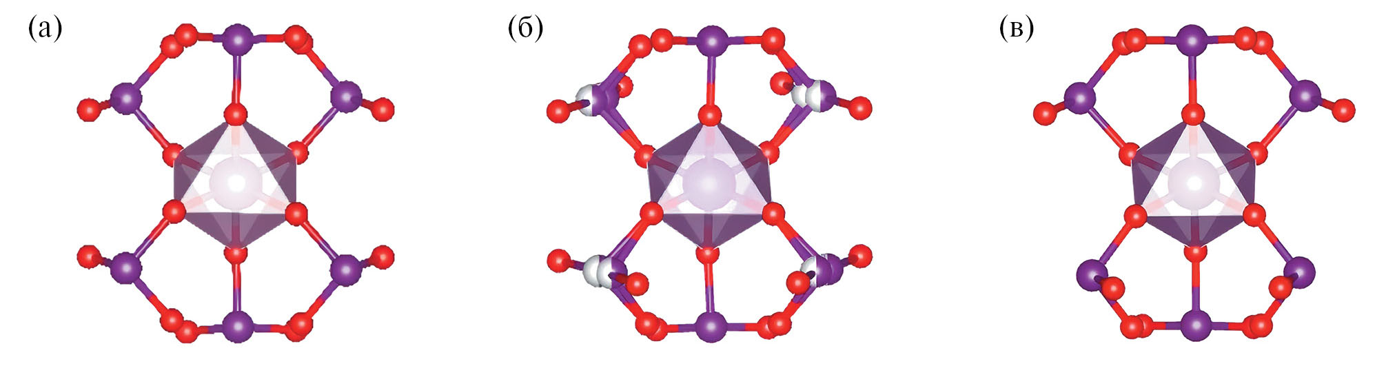 Тригональные структуры с псевдоцентросимметричными блоками. В некоторых случаях блоки [М(IO3)6] в структурах имеют собственную, локальную псевдосимметрию, которая может быть выше симметрии всей структуры. Так, в структуре полученного недавно иодата Cs3Ta(IO3)8 [51], несмотря на ацентричную пр. гр. P31c, имеются изолированные центросимметричные блоки [Ta(IO3)6] с симметрией (рис. 4а). Центр инверсии в них является локальным псевдоэлементом симметрии. Блоки в структуре располагаются на одном уровне, а на другом уровне находятся изолированные группы IO3 (также связанные псевдоцентром инверсии) и один из атомов Cs, нарушающий псевдоцентр инверсии (рис. 4в). Похожая ситуация наблюдается в структуре KSc(IO3)3Cl, пр. гр. R3 [37], где точечная симметрия блоков [Sc(IO3)6] также отвечает точечной группе с псевдоцентром инверсии, отсутствующим как элемент симметрии во всей структуре (рис. 4б). Особенностью структуры KSc(IO3)3Cl является соединение блоков [Sc(IO3)6] в каркас, в полостях которого расположены атомы K и Cl (рис. 4г).
