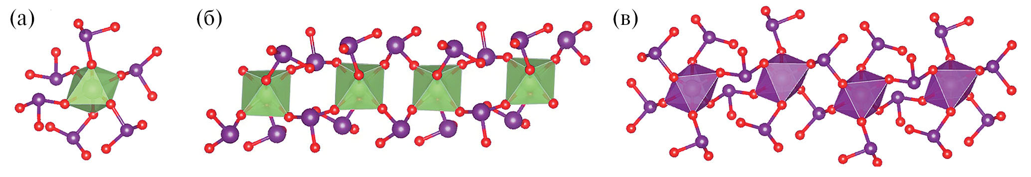 В структурах иодатов, принадлежащих семейству AIn(IO3)4 (A = Na, Ag), несмотря на общую пр. гр. P21/c, имеются различия в конфигурации и симметрии блоков: в структурах обеих модификаций NaIn(IO3)4 блоки [In(IO3)6] центросимметричны (рис. 8а), тогда как в структуре AgIn(IO3)4 центр инверсии в блоках отсутствует (рис. 8б). Во всех трех структурах блоки связаны общими иодатными группами в цепочки, слегка различающиеся конфигурацией (рис. 8в, 8г).