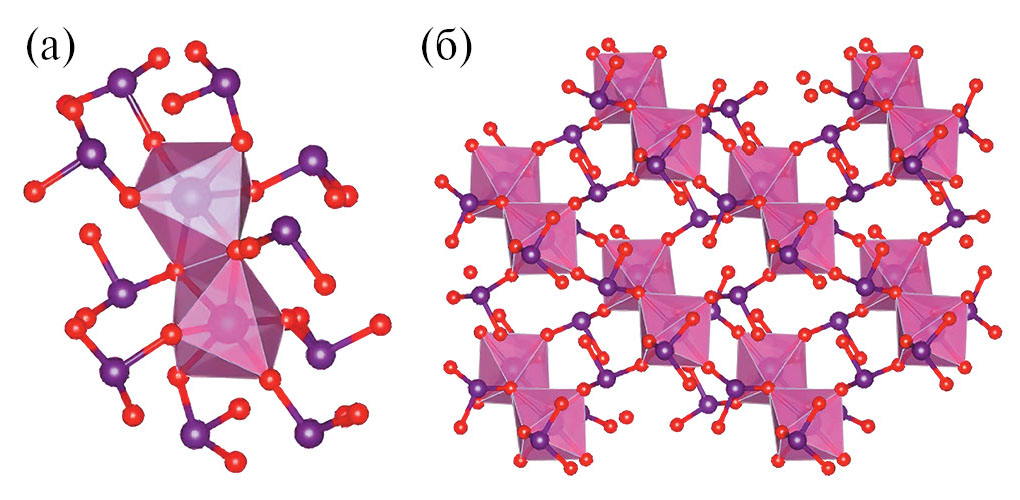 Рис. 11. Димеры [Mn2(IO3)10] (а); их соединение в каркас в структуре AgMn(IO3)3 (б).