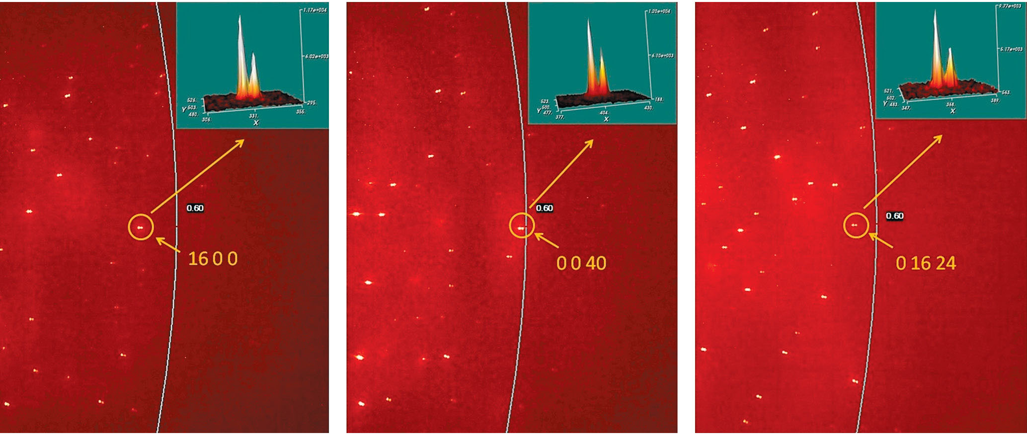 Рис. 1. Дифракционные картины (Bruker D8 Venture, MoKα-излучение, ω-сканирование в диапазоне 3°) монокристалла α-S в разной ориентации. Рядом с дугами показано ориентировочное значение межплоскостного расстояния. Показаны индексы рефлексов, по которым было проведено уточнение параметров ячейки. На вставках представлены профили дублетов.