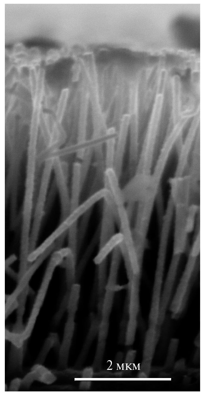 Длину получаемых нанопроволок контролировали в растровом электронном микроскопе (РЭМ) JCM 6000 Plus (Jeol, Япония) со встроенной приставкой для энергодисперсионный спектроскопии. РЭМ-изображение массива нанопроволок представлено на рис. 1. Исследования проводили в режиме детектирования вторичных электронов при ускоряющем напряжении 15 кВ. Видно, что серебряные нанопроволоки расположены не строго перпендикулярно поверхности матрицы и часто пересекаются. Длина нанопроволок, заполняющих поры матрицы ПЭТФ, неодинакова в одном и том же образце.