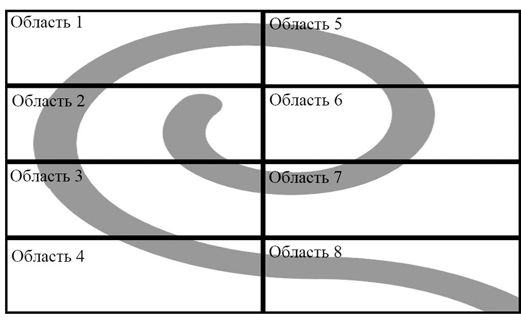 Механические свойства образцов исследовали в режиме одноосного растяжения на универсальной испытательной машине Autograph AGS-5kN (Shimadzu, Япония) при скорости растяжения 2 мм/мин. Образцы обеих серий были нарезаны на восемь частей (рис. 2, области 1–8), после чего из этих частей были получены полоски с размером рабочей части 5 × 18 мм с помощью ручного вырубного пресса RR/HCP (RAY RAN, Англия). Направление растяжения было выбрано параллельно ходу прокатки пленки. Исследовали упругость (Е) и прочность на разрыв (Р).