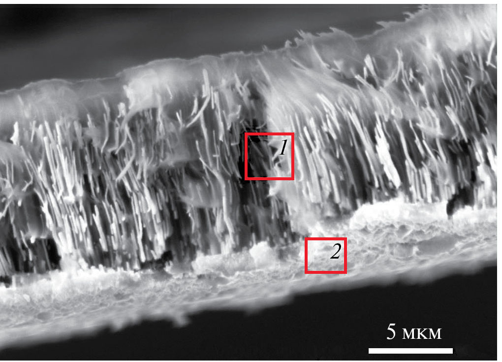 Рис. 3. РЭМ-изображение образца композита со стороны поперечного сечения (1) и плоскости матрицы (2).