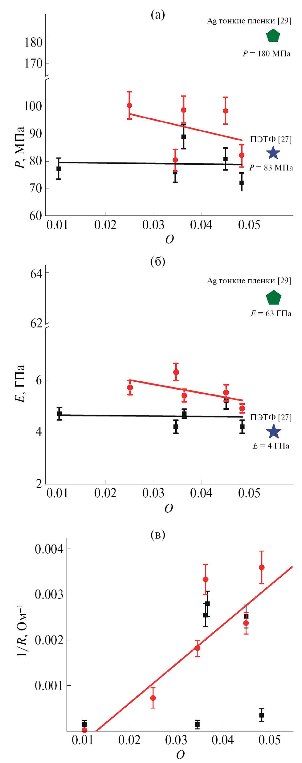 Исследования электрических и механических характеристик подтверждают эти предположения. Измерения механических характеристик показали возможность упрочнения трековой мембраны в результате образования массива нанопроволок. Действительно, по сравнению с исходной ПЭТФ-мембраной [27] Е и Р выше у образцов второй серии. Наблюдается динамика линейного падения механических характеристик с увеличением О. Это связано с увеличением скорости роста при увеличении О, что приводит не только к более быстрому образованию переростков, но и к увеличению неоднородности нанопроволок по длине [28]. В результате происходит разрыв в областях неоднородностей. В случае образцов первой серии распределения прочности на разрыв, а также упругости относительно однородны при различных значениях О, однако механические характеристики находятся на уровне исходной ПЭТФ-мембраны. Это может быть связано с избыточным временем роста образцов, приводящим к образованию большого количества переростков. В случае образцов первой серии такие переростки присутствовали на всей поверхности трековой мембраны. В результате образовывалась многослойная структура с практически сплошной, неравномерной пленкой из смеси серебра и галогенидов серебра, которая после роста механически удалялась, оставляя после себя нарушенный массив нанопроволок. Это приводило к ухудшению механических характеристик композита и потере армирующего характера массива нанопроволок.