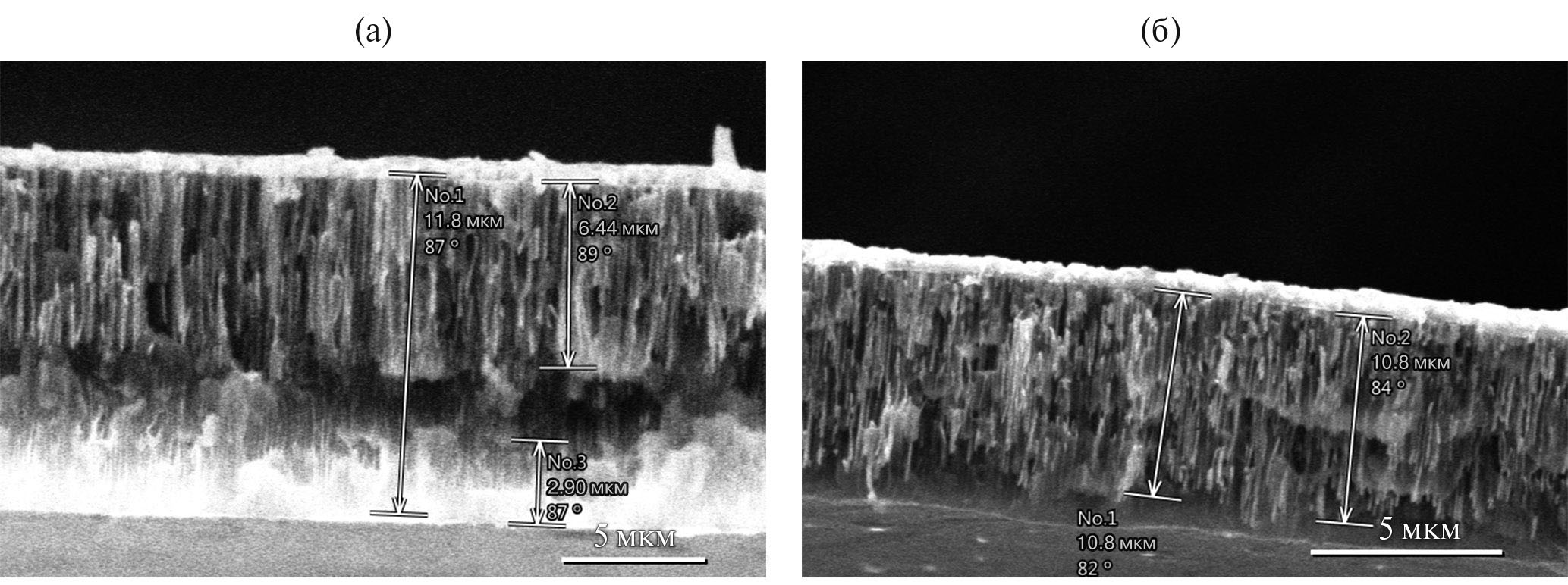 Синтез массива серебряных нанопроволок в трековой мембране. Для получения структур использовали промышленные трековые мембраны из полиэтилентерефталата (ПЭТФ) толщиной 12 мкм с порами диаметром 100 нм и плотностью 1.2 × 109 см–2 производства ОИЯИ (г. Дубна, Россия). Отклонение угла наклона пор составляла до ±30° по ходу прокатки пленки (по вертикали) при облучении ионами и ±0.5° перпендикулярно ходу прокатки пленки (по горизонтали).