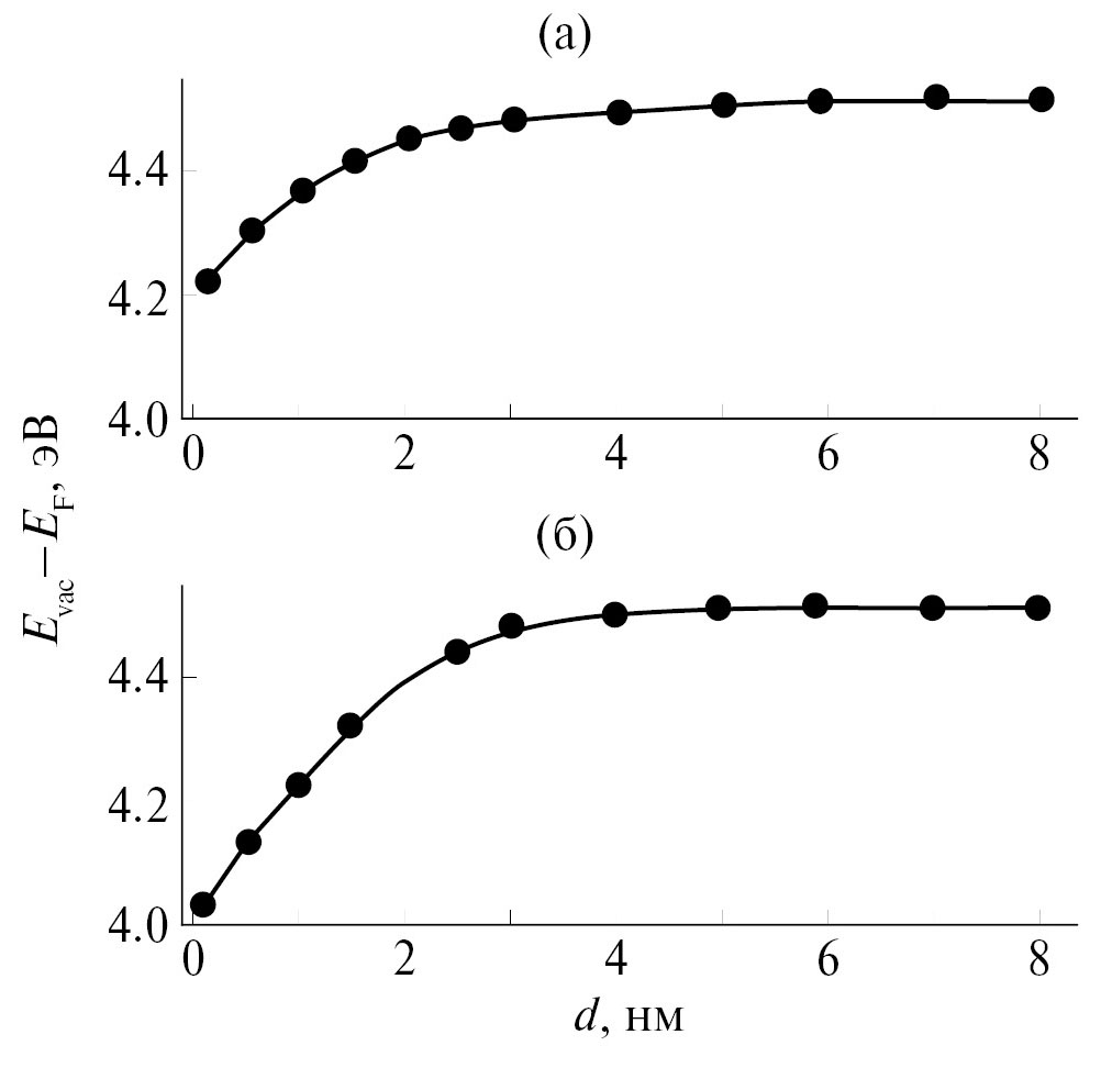 В ходе эксперимента измеряли энергетическое положение первичного максимума спектра в процессе осаждения органического слоя, что дало возможность установить изменения Evac поверхности относительно EF, т. е. изменения работы выхода поверхности при ее функционализации покрытием FP5. Следует учитывать погрешность определения значений Evac – EF 0.1 эВ вследствие разброса значений энергии электронов в тестирующем пучке. Значение Evac – EF подложки ZnO составило 4.2 эВ. Оно хорошо воспроизводимо в разных сериях изготовления ZnO [15]. Монокристалл ZnO(0001) имеет более высокую работу выхода. Характерные значения Evac – EF поверхности (SiO2)n-Si лежат в диапазоне 4.0–4.2 эВ [16, 24]. Отклонения в рамках этого диапазона, вероятно, обусловлены отклонениями в процедуре предварительной очистки. В результате осаждения пленки FP5 на подложку ZnO повышалась работа выхода от 4.2 до 4.5 эВ (рис. 3а). Исходная работа выхода подложки (SiO2)n-Si составила 4.0 эВ, а осаждение пленки FP5 привело к ее повышению до 4.5 эВ (рис. 3б). Наиболее значительные изменения Evac – EF происходят при увеличении толщины органического покрытия до 3–4 нм, а при дальнейшем формировании пленки толщиной до 5–8 нм величина Evac – EF выходит на насыщение. Перенос заряда на границе пленки FP5 с обеими подложками представляет собой перенос отрицательного заряда (электронов) из подложки в органическую пленку, так как экспериментально установлено увеличение значений Evac – EF в процессе осаждения пленки. Обратим внимание на то, что при различной работе выхода подложек сформированные на них пленки FP5 толщиной 5–8 нм имеют одинаковую работу выхода. Это соответствует литературным данным, согласно которым при отсутствии взаимодействия на границе подложка–органический слой и при толщине органического слоя более 3 нм работа выхода не зависит от материала подложки [8, 25, 26]. Согласно результатам [7], потенциал ионизации FP5 в виде молекул в растворе составляет 5.2–5.3 эВ, а запрещенная зона FP5 – приблизительно 3 эВ. Таким образом, принимая во внимание установленную работу выхода, можно предположить, что уровень EF в пленке FP5 расположен в нижней половине запрещенной энергетической зоны.