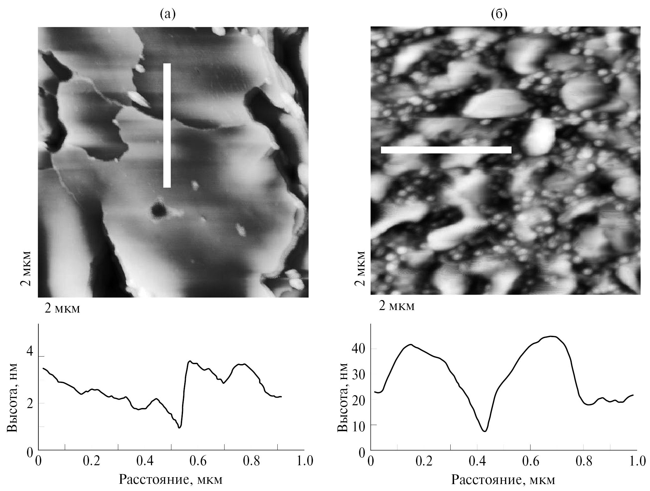 Рис. 4. АСМ-изображение участка 2 × 2 мкм поверхности пленки FP5 на поверхности (SiO2)n-Si (а) и ZnO (б). Профиль участка поверхности на отмеченном отрезке показан снизу.