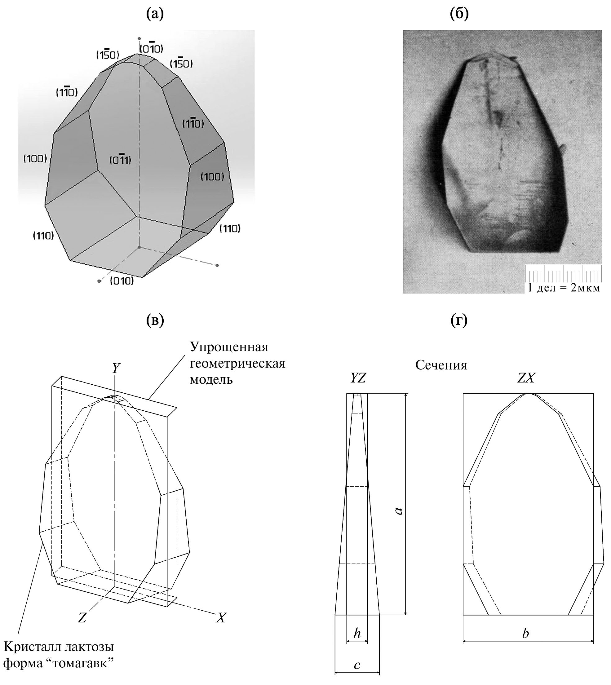 Рис. 1. Типичный кристалл лактозы в форме томагавка с индексами Миллера для его граней (а) и фотография кристалла с увеличением в 62 раза [20] (б); упрощенная геометрическая модель кристалла лактозы (в), (г).