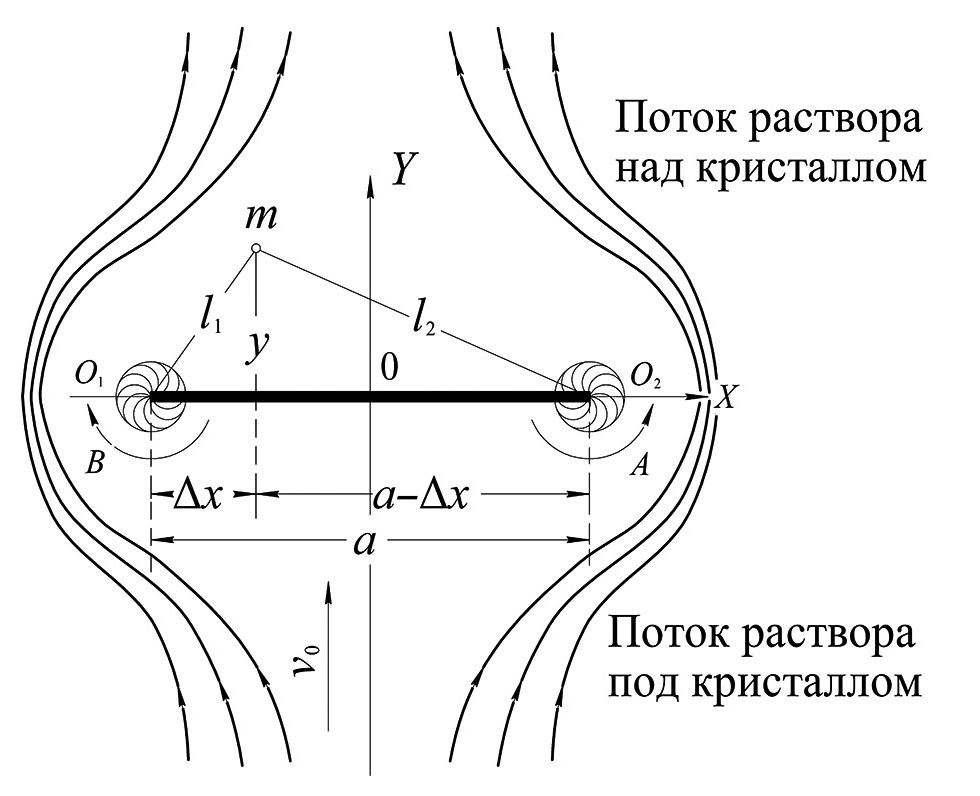 Если рассматривать кристалл как пластину, имеющую малую толщину, обтекаемую потоком жидкости со скоростью v0 в направлении оси Y (рис. 2), то согласно теории динамического взаимодействия тел и жидкости [18] на ее краях будут образовываться вихревые шнуры О1 и О2 конечных размеров. Окружная скорость потока в вихревых шнурах обратно пропорциональна расстоянию до оси этих вихревых шнуров, проходящих через точки А и В. Поэтому теоретически при приближении к оси вихревого шнура скорость потока неограниченно возрастает, при этом статическое давление теоретически может падать до отрицательных значений и образования зон кавитации, что создает условия, согласно [15], для возникновения кристаллических зародышей.