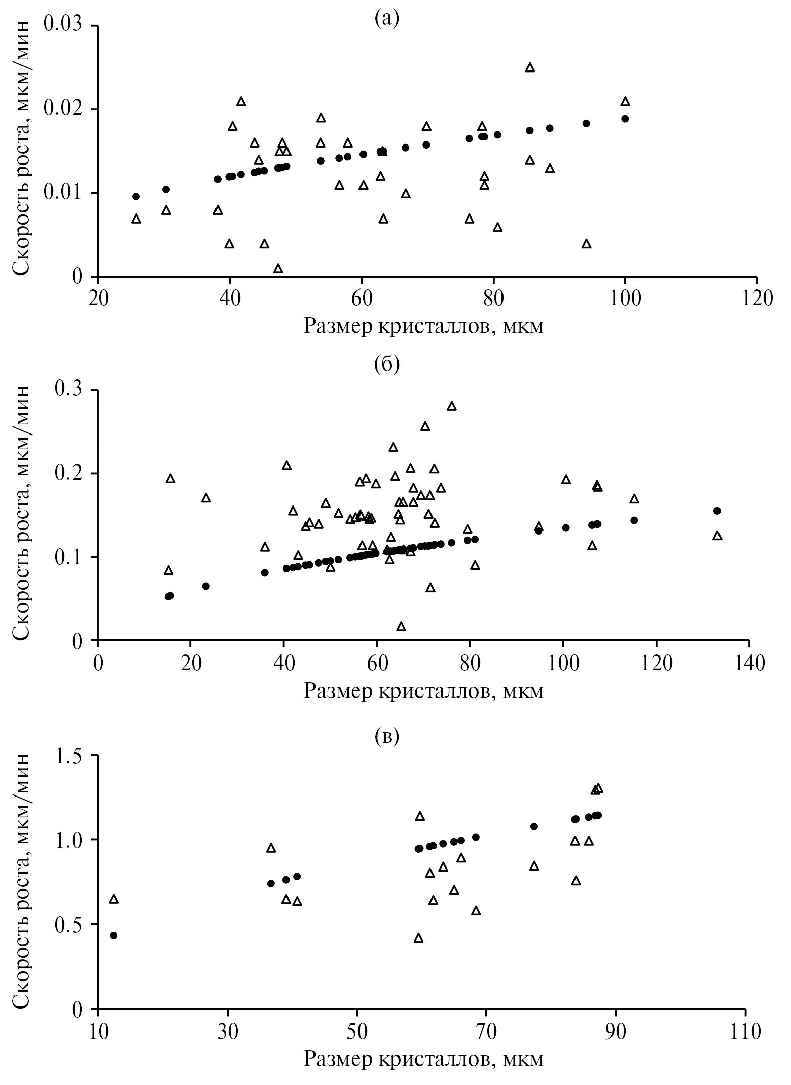 Рис. 4. Зависимость скорости роста кристаллов лактозы от его размера при температуре 30°C и пересыщении 0.55 (а), 1.29 (б) и 2.75 (в); Δ – опытные данные [39], • – теоретические данные (формула 15).