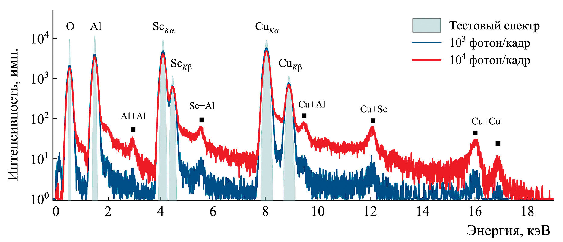 Уменьшение интенсивностей спектральных линий при увеличении потока фотонов связано с перекачкой событий в пики наложений, а также с отсеиванием событий при частичных наложениях. Для серии данных с 103 фотонов на кадр в спектрах наблюдается незначительное увеличение фона за счет формирования пиков наложений, эффективность счета фотонов превышает 97%. В энергетическом спектре в серии данных с 104 фотонов на кадр наблюдается уменьшение интенсивности пиков и происходит значительное увеличение фона, на котором хорошо различаются пики наложений, а эффективность счета фотонов снижается до 77%.