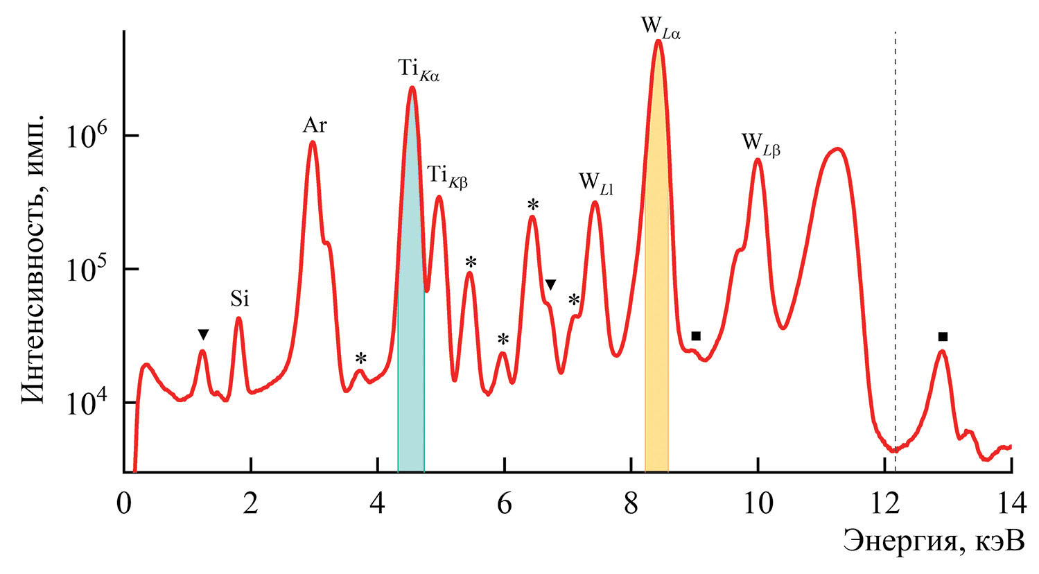Рис. 6. Флуоресцентный спектр образца W(3 нм)/Ti(16 нм)/W(3 нм): звездочки – флуоресцентные линии экспериментального оборудования, треугольники – пики вылета, квадраты – пики наложений.