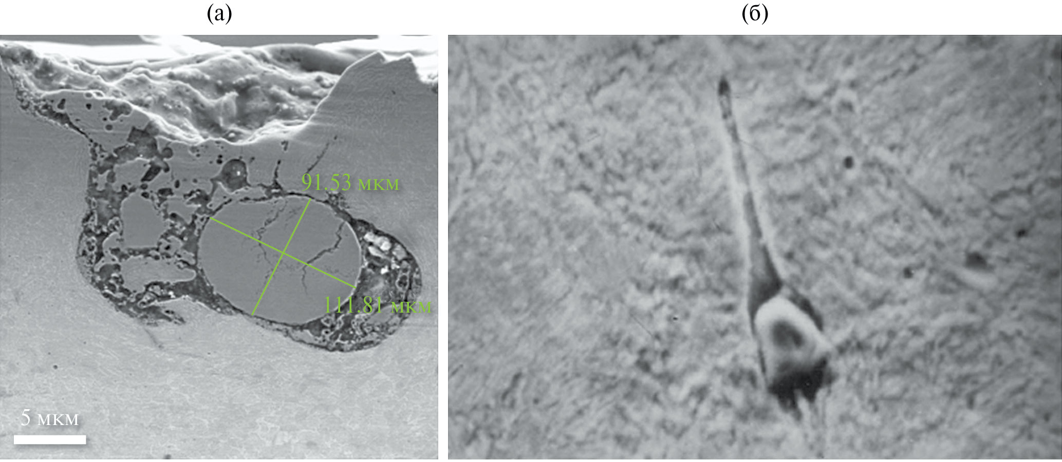 Рис. 2. Частица железа, внедрившаяся в поверхность мишени из железо-никелевого сплава (а); частица, проникшая в сталь на большую глубину (б).