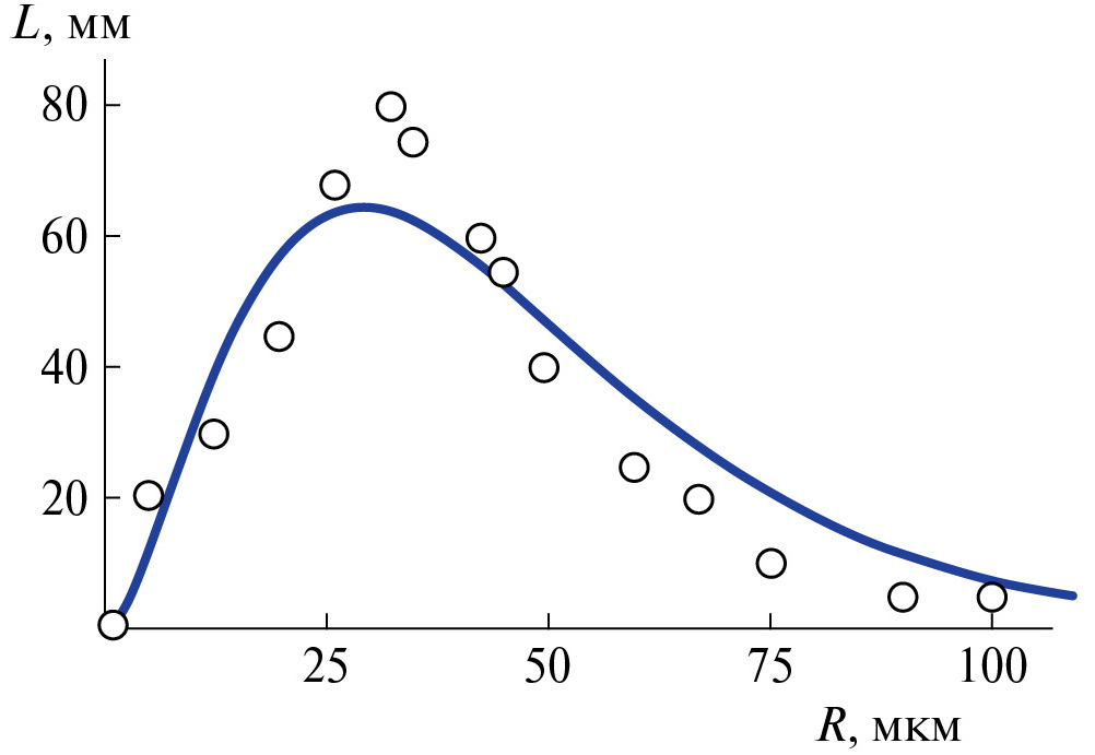 Рис. 3. Зависимость глубины L проникания быстрой частицы от ее радиуса R.