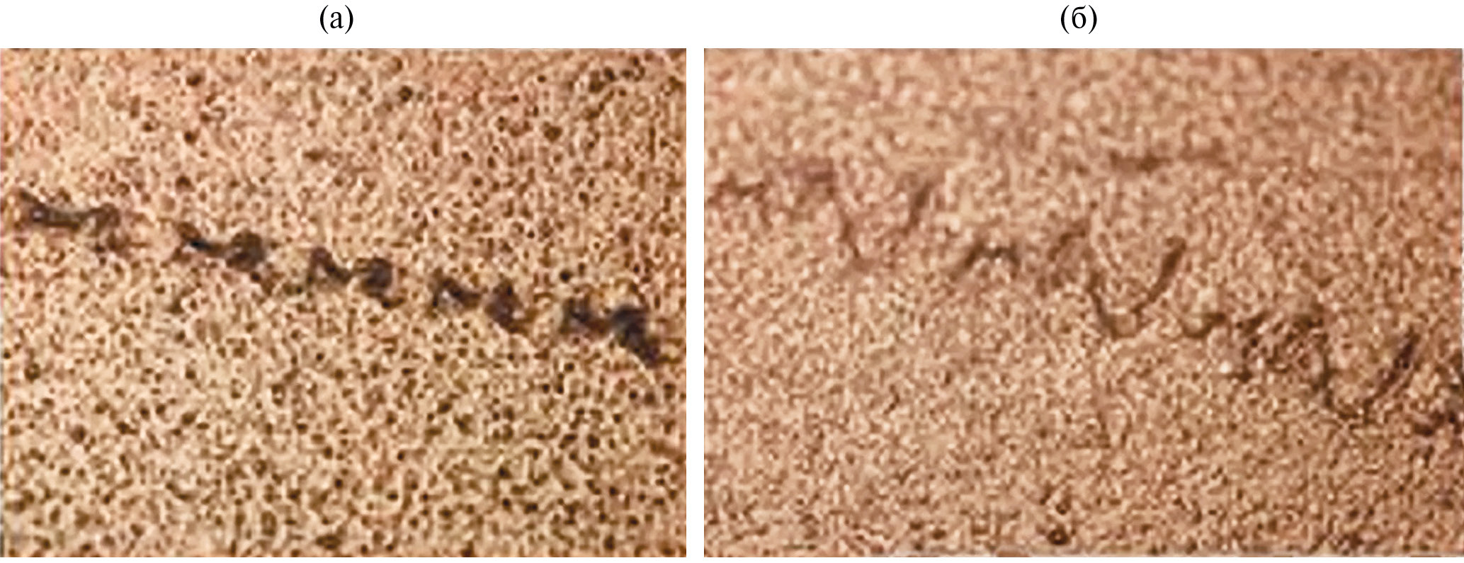 Рис. 4. Треки, образовавшиеся на фотопленке, обернутой вокруг цилиндрического образца: а – образец из алюминия (×500), б – образец из стали (×600).