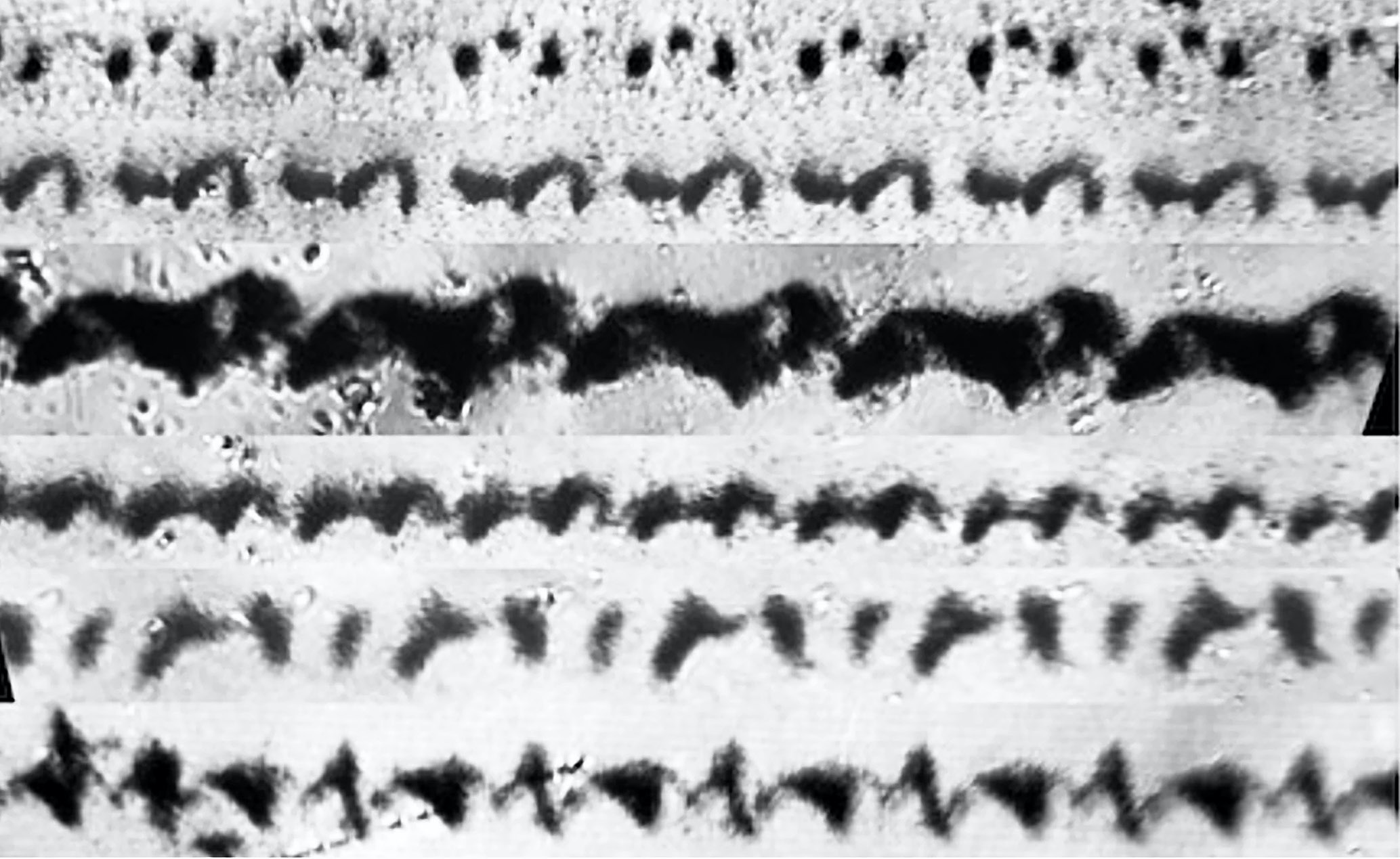 При проведении исследований поверхность цилиндрической мишени оборачивали рентгеновской фотопленкой, завернутой в несколько слоев черной бумаги. После проявления на фотопленке обнаружены линии (треки) длиной (10–15) × 10–3 м и шириной (2–4) × 10–6 м. Вид треков был разный – наблюдались как непрерывные, так и треки сложной формы, похожие на спирали или меандр. На рис. 4 показан вид треков при большом увеличении [3]. Частицы, оставившие треки, двигались параллельно плоскости фотопленки. Энергия частиц, оцененная по длине пробега, была не меньше 80–100 МэВ. Такие же треки обнаружены на поверхности пластины кремния, расположенной рядом с цилиндрической мишенью [3].