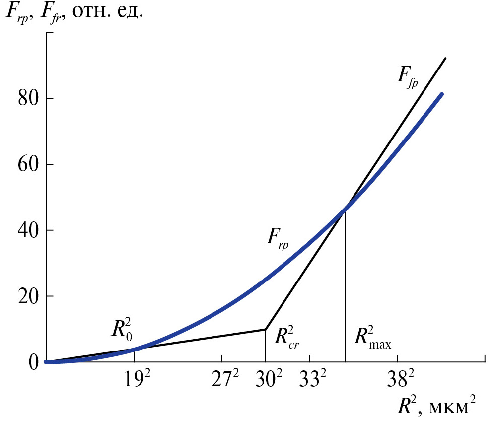 Для удобства анализа отложим по горизонтальной оси значения R2. В этом случае зависимость Frp = f(R2) на рис. 6 имеет вид параболы. Противоположно силе Frp действует сила Ffr трения частицы о стенку канала в мишени. Эта сила появляется из-за роста числа дислокаций в материале мишени [32]. При небольшой скорости образования дислокаций (и, соответственно, при малых значениях радиуса частицы) величину силы торможения можно считать пропорциональной площади поверхности трущейся частицы: Ffr ~ R2. Однако при некотором значении радиуса Rcr плотность образующихся дислокаций достигает максимального значения и в результате резко увеличивается твердость металла. Поэтому можно считать, что при R > Rcr2 закон торможения частицы меняется на Ffr ~ nR2, где n > 1. На рис. 6 показана эта зависимость при n = 2. Можно видеть, что в областях 0 < R2 < R02 и R2 > Rmax2 сила трения больше электрической силы Frp, следовательно, движение частицы невозможно. При R2 = Rcr2 степень превышения силой Frp величины силы Ffr максимальна, что способствует прониканию частиц с R = Rcr на большие расстояния.