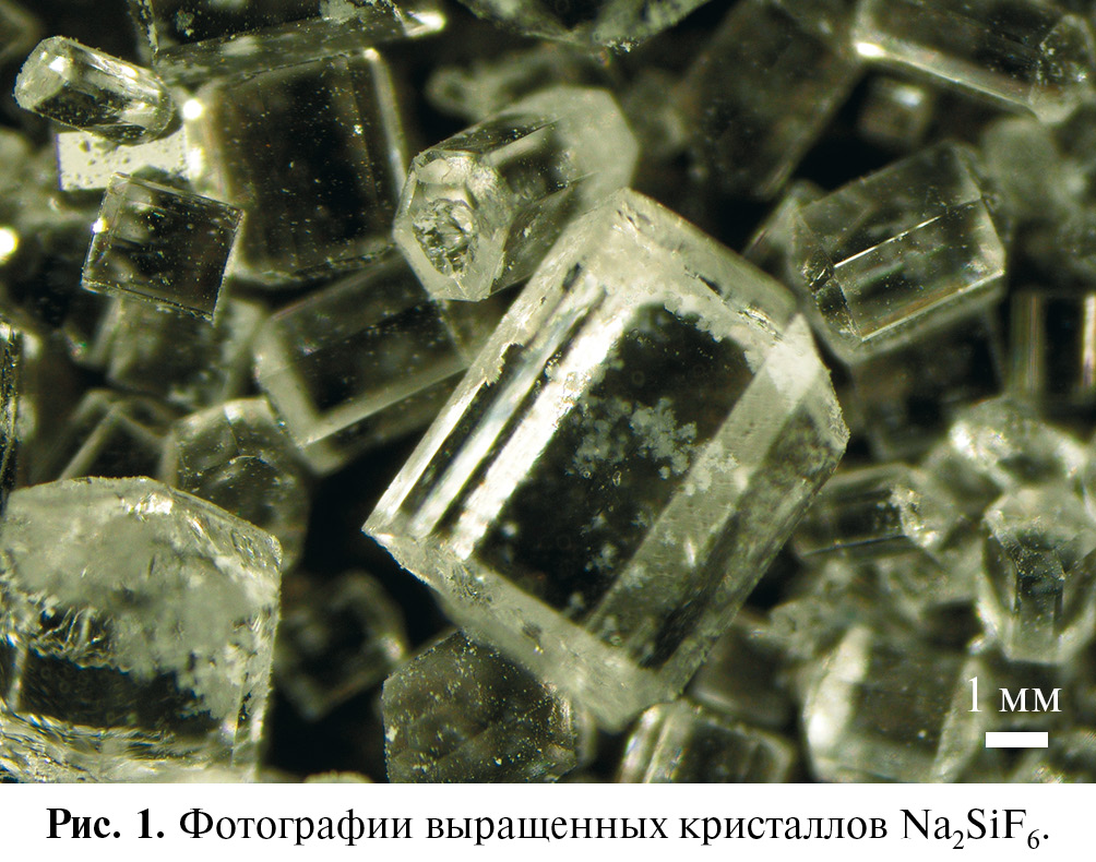 Наиболее крупные кристаллы миллиметрового размера Na2SiF6 выращивали из водных растворов методом испарения растворителя, используя различные прекурсоры [21]. Работ по выращиванию объемных кристаллов Na2SiF6 не обнаружено, так как традиционно используют методы “мокрой химии” для получения легированных микрокристаллов Na2SiF6 для спектроскопических приложений [22]. Термическая нестабильность этого соединения препятствует применению для роста кристаллов расплавных методов или твердофазного синтеза.