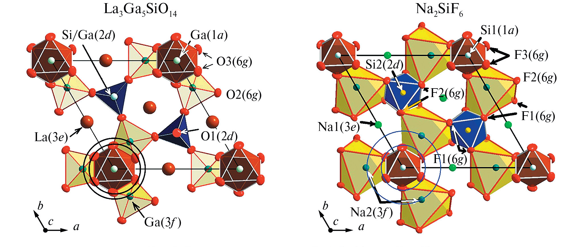 Сравнение структур La3Ga5SiO14 и Na2SiF6. Обнаружено большое структурное сходство кристаллов Na2SiF6 с кристаллами семейства лангасита (рассмотрено на примере La3Ga5SiO14). Кристаллы принадлежат к одной пр. гр. P321, параметры их элементарных ячеек близки (табл. 2), локальная симметрия шести из семи базисных атомов, включая все катионы, совпадает.
