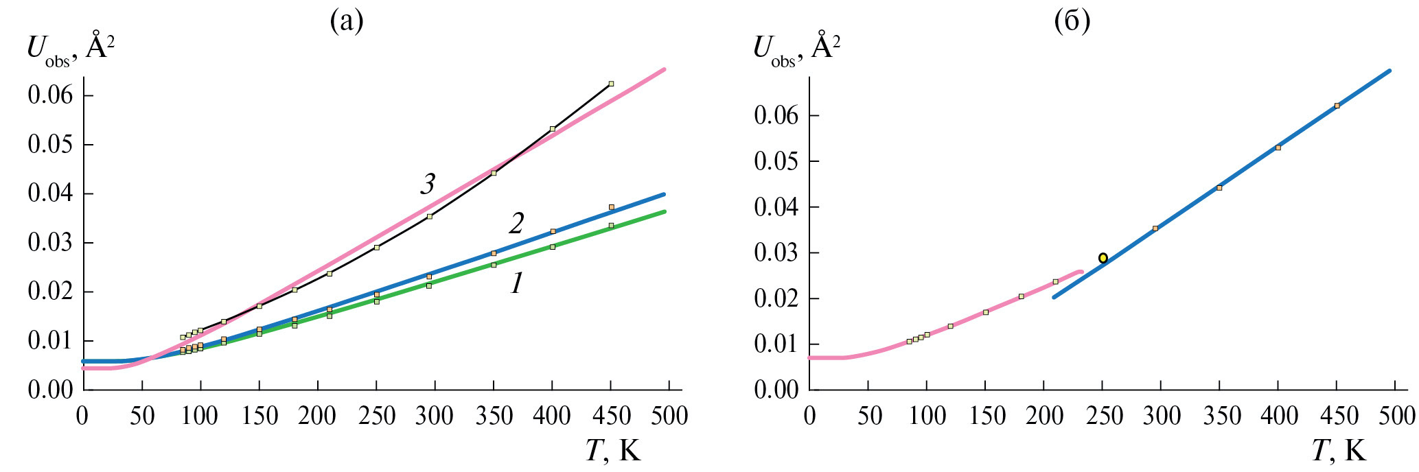 Рис. 4. Температурные зависимости эквивалентных параметров смещений атомов фтора Uobs(T) в кристалле Na2SiF6: а – F1(6g) (1), F2(6g) (2), F3(6g) (3), б – F3(6g). Точки – экспериментальные данные. Сплошные кривые – подгонка экспериментальных Uobs с помощью расширенной модели Эйнштейна [26] (а) и двух расширенных моделей Эйнштейна [26] (б).