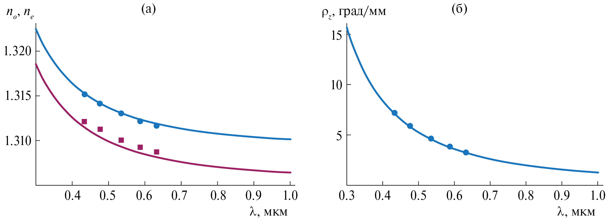 На рис. 6 приведены зависимости величин no, ne и ρz от длины волны. Сплошные кривые на рис. 6а – показатели преломления, рассчитанные на основе данных [13] в соответствии с формулами: