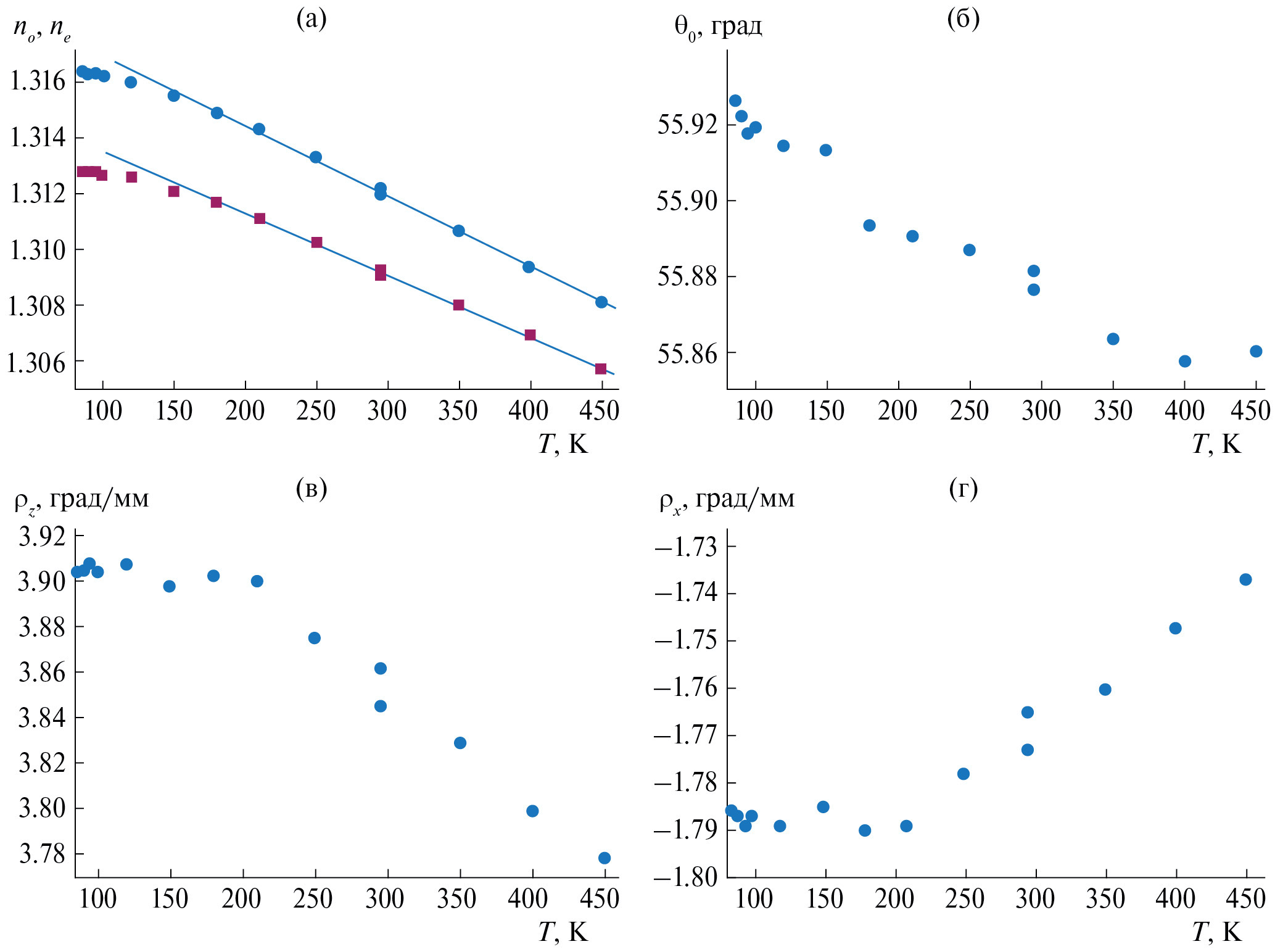 Рис. 7. Зависимости от температуры: а – показателей преломления; б – угла θ0, характеризующего направление, в котором ρ = 0; в – вращения плоскости поляризации света вдоль оптической оси ρz, г – вращения плоскости поляризации света перпендикулярно оптической оси ρx.
