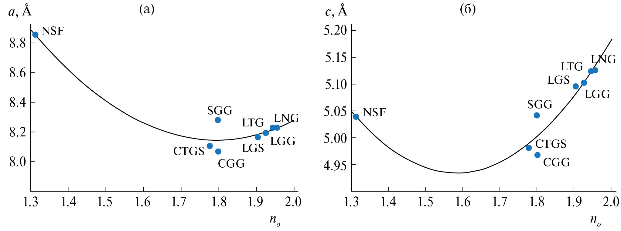 Рис. 8. Зависимость параметров элементарной ячейки а (а) и с (б) от показателя преломления обыкновенного луча no для кристалла Na2SiF6 и кристаллов семейства лангасита, для которых известны экспериментальные значения no, ne. NSF – Na2SiF6, CTGS – Ca3TaGa3Si2O14, CGG – Ca3Ga2Ge4O14, SGG – Sr3Ga2Ge4O14, LGS – La3Ga5SiO14, LGG – La3Ga5GeO14, LTG – La3Ga5.5Ta0.5O14, LNG – La3Ga5.5Nb0.5O14.