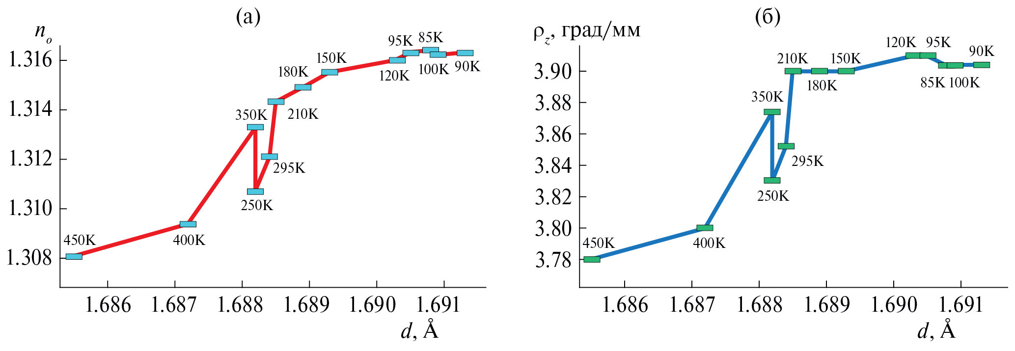 В случае Na2SiF6 на зависимости no = f(d) имеется область, где кривизна меняет знак (рис. 9а). Это область структурной перестройки (изменений локальной симметрии) при 210–250 К, в которой результаты являются по смыслу неустойчивыми. Ниже этих температур происходит излом зависимостей no(T) (рис. 7). Примечательно, что точки (d, n) расположились в порядке убывания температуры (кроме “перестроечных” при 210 и 250 К и малоразличимых данных при 85 и 95 К). Такое невозможно при серьезных ошибках и является доказательством высокой точности и самосогласованности всего многотемпературного исследования. Остальные зависимости оптических параметров от межатомного расстояния Si2(2d)–F2(6g) (рис. 7) имеют аналогичный вид (на рис. 9б дан пример для величины ρz).