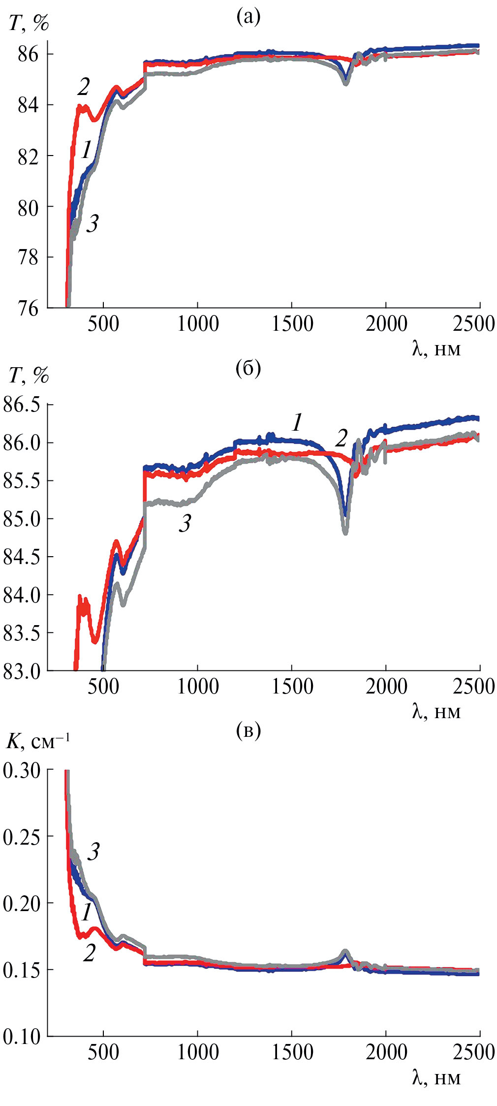 В первую очередь были измерены спектральные зависимости коэффициентов пропускания T всех образцов в неполяризованном свете. Полученные результаты представлены на рис. 1а, 1б. На рис. 1в показаны спектры показателей поглощения K, рассчитанных по приближенной формуле K = –lnT/d [24].