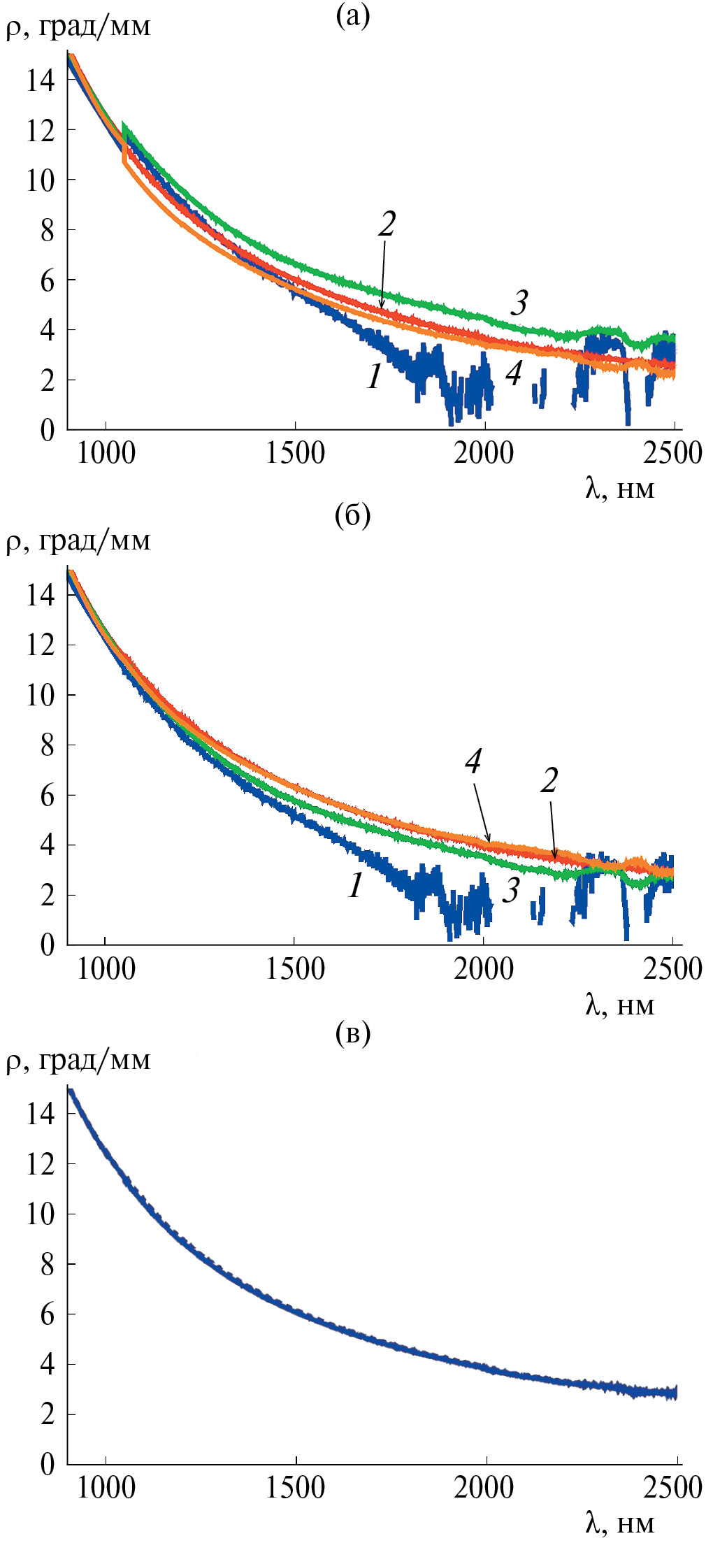 Аналогичные расчеты ρ проведены для образцов 2 и 3. Учитывая практически одинаковые спектры коэффициентов пропускания (рис. 2), следует ожидать близких значений оптической активности для всех трех образцов.
