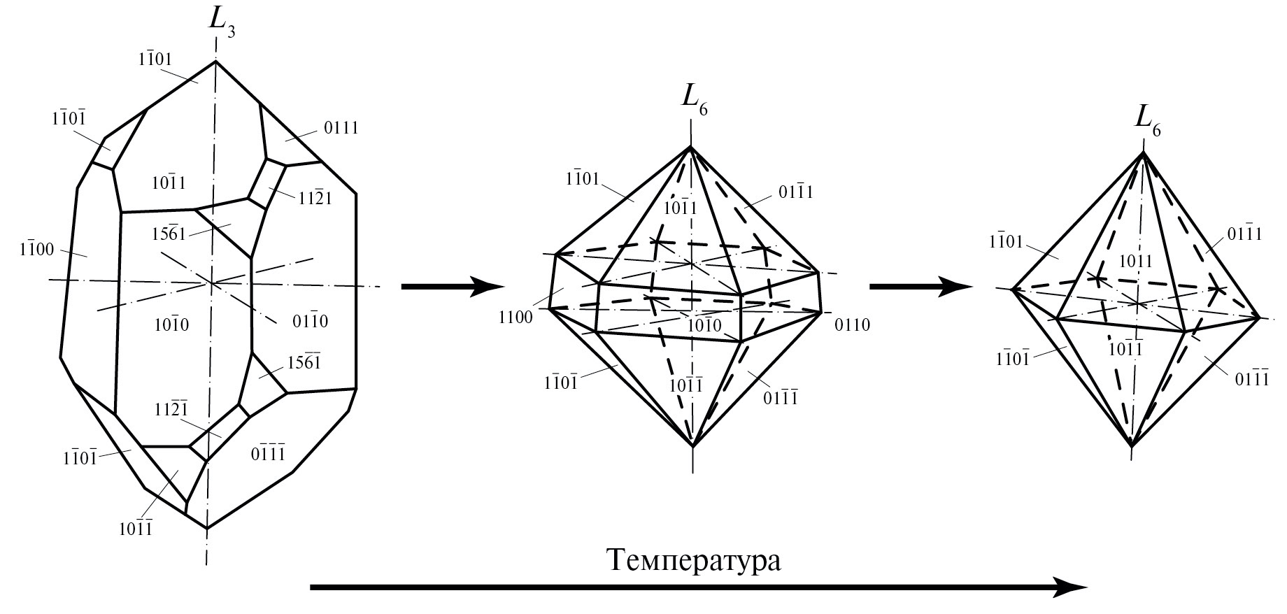 Рис. 1. Ряд преобразований кристалла β-кварца: а – полярный, призматически-ромбоэдрический, низкотемпературный; б – базисный, призматически-бипирамидальный, относительно высокотемпературный; в – базисный, конечный бипирамидальный, высокотемпературный.
