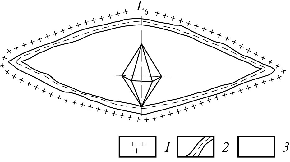 Рис. 2. Бипирамидальный кристалл β-кварца в жеоде порфировидного гранита (зарисовка): 1 – порфировидный гранит, включающий в себя жеоду; 2 – кристобалитовая подложка; 3 – кремнисто-флюидная камера в процессе роста кристалла бипирамидального β-кварца. Масштаб 1 : 1.