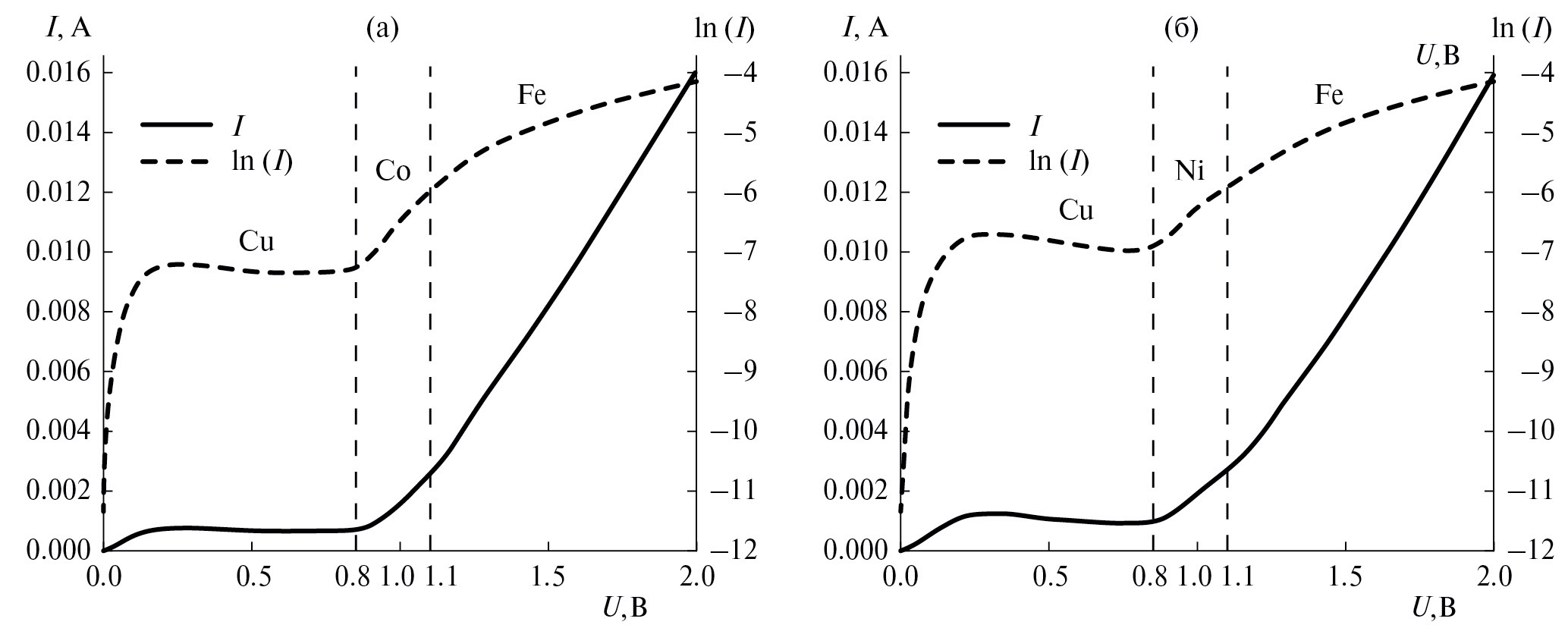 Характер поляризационных кривых схож для обоих составов электролитов, что обусловлено близостью электродных потенциалов Co и Ni. Кривые имеют характерные для осаждения многокомпонентных систем участки. Так, при напряжении меньше 0.8 В в обоих случаях присутствует плато на графике, которое соответствует критическому току осаждения меди как материала с наименьшим равновесным потенциалом осаждения. По мере роста напряжения (при значениях больше 0.8 В) начинается осаждение Co и Ni в соответствующих электролитах, что выражается в заметном изменении силы тока. При напряжении выше 1.2 В в обоих случаях начинается интенсивное осаждение Fe, что также выражается в изменении характера поляризационной кривой.