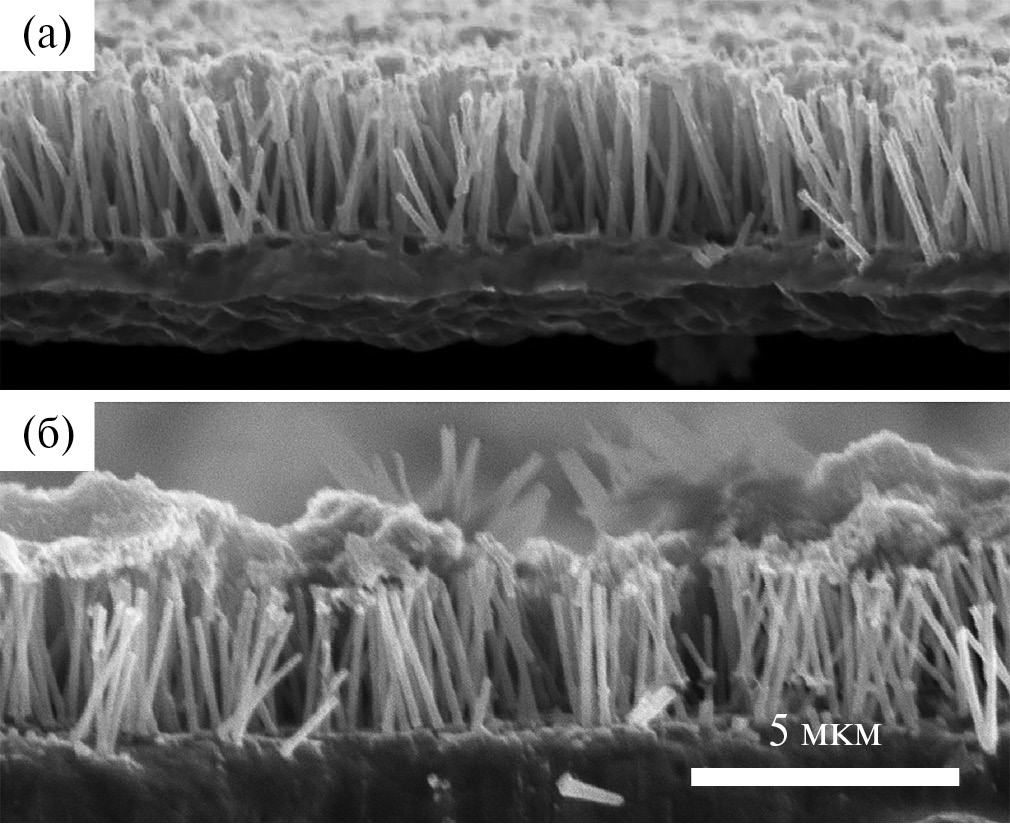 Микроскопия и элементный анализ. Пример полученных РЭМ-изображений НП приведен на рис. 2. Результаты РЭМ показали схожесть морфологии НП, получаемых из разных электролитов. Рост НП достаточно равномерен, во всех случаях различим фронт заполнения матрицы.
