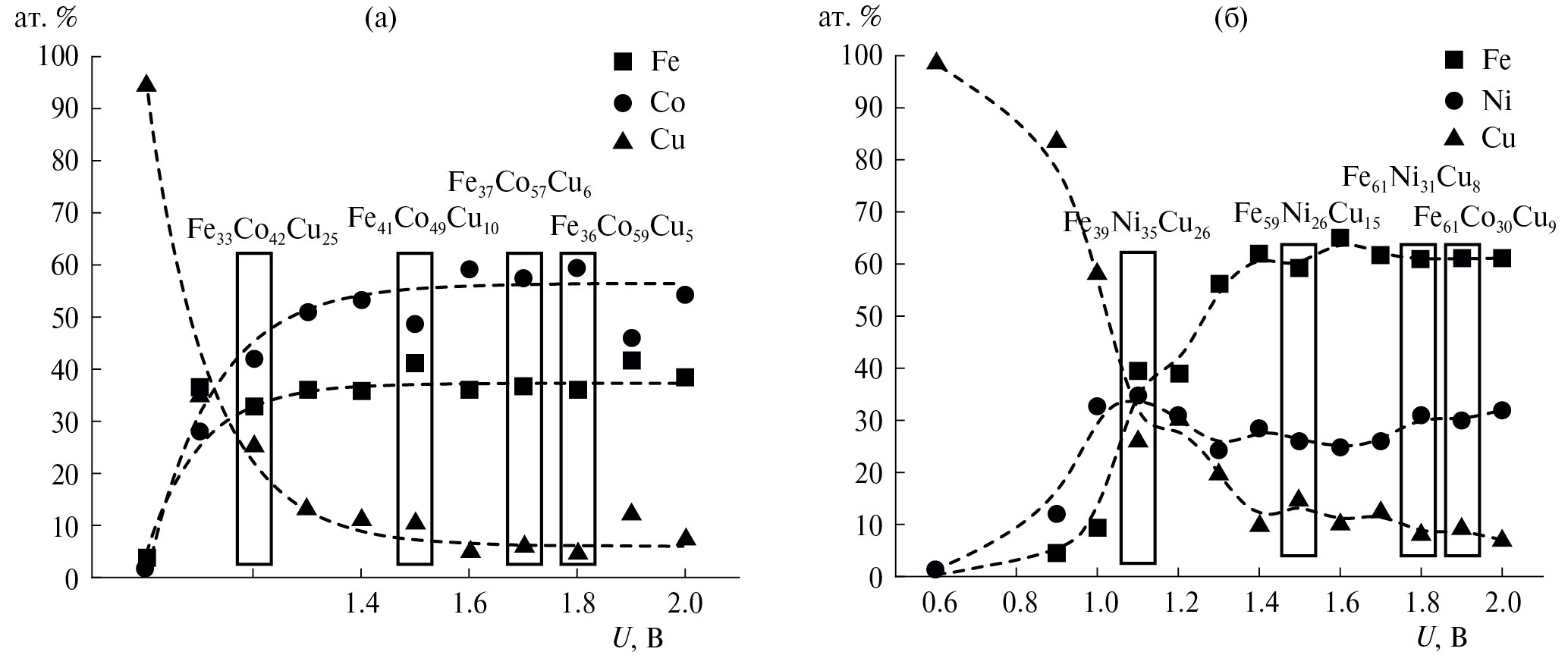 Из рис. 3 видно, что изменение состава НП в зависимости от напряжения осаждения имеет нелинейный характер с выходом на плато при напряжении U выше 1.6 В. Преимущественное осаждение ферромагнитных металлов для обоих составов происходит при напряжении, превышающем 1 В, что соответствует значениям, полученным из поляризационной кривой. Концентрация Cu с ростом напряжения уменьшается. При этом значения концентрации меди ниже 10 ат. % наблюдаются при достижении напряжения 1.6 В.