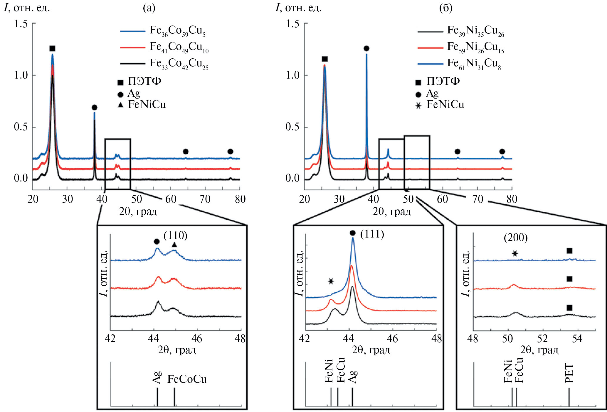 Результаты РФА показали для первого состава образование трехкомпонентного твердого раствора FeCoCu. Во втором случае образуются НП из смеси фаз твердого раствора на основе: FeCu с содержанием Cu до 80%, FeNi с высоким содержанием Fe, а также NiCu с содержанием Ni до 80% предположительно в аморфном или мелкокристаллическом состоянии. Все это приводит к смещению наблюдаемого пика на рентгенограммах в сторону больших углов. Предварительный анализ по методу Ритвельда показал, что доля фазы твердого раствора на основе FeCu относительно FeNi увеличивается с ~5–6% для Fe61Ni31Cu8 до ~26–30% для Fe39Ni35Cu26, что соотносится с данными мессбауэровской спектроскопии.