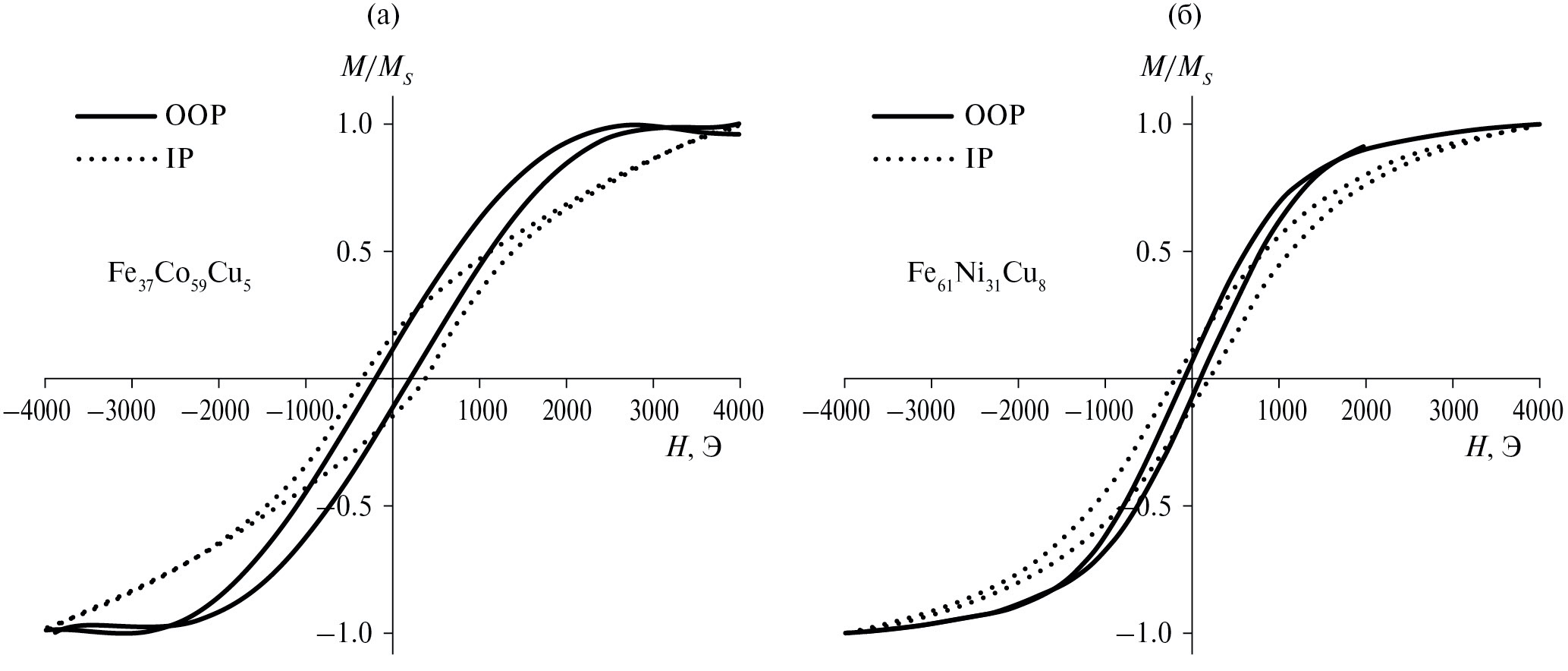 Величина Hc оказывается большей в направлении IP для всех образцов. Если предположить, что средний угол отклонения намагниченности от направления OOP равен α, то коэрцитивная сила в направлении OOP Hc = Hc0/cosα, тогда как для направления IP Hc = Hc0/sinα, где Hc0 соответствует Hc за счет смещения доменов для параллельной ориентации магнитного поля и оси легкого намагничивания. То есть при α < 45° значение Hc для направления IP оказывается выше. Процессы, связанные с когерентным вращением намагниченности, на начальных этапах перемагничивания должны быть несущественны. Петли гистерезиса для НП FeNiCu почти идентичны в обоих направлениях, что обусловлено хаотической ориентацией магнитных моментов.