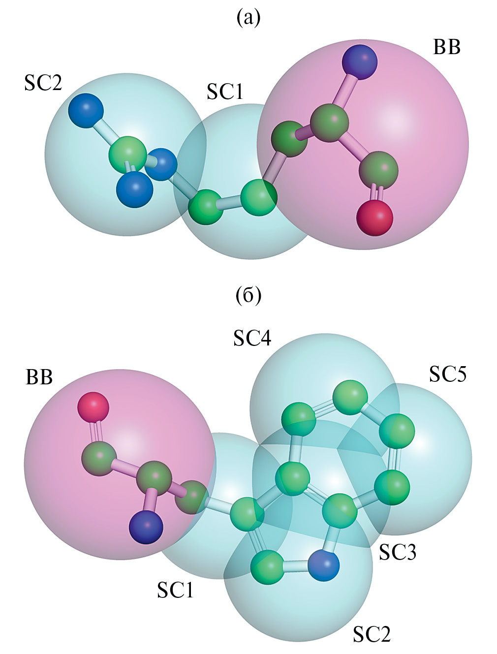 Рис. 1. Соответствие атомистической и крупнозернистой (в поле MARTINI) структуры аминокислотных остатков аргинина (а) и триптофана (б). Для наглядности атомы водорода скрыты. Полупрозрачными сферами показаны частицы в MARTINI: ВВ (Backbone) относятся к основной цепи белка, а SC (Side Chain) – к боковой.