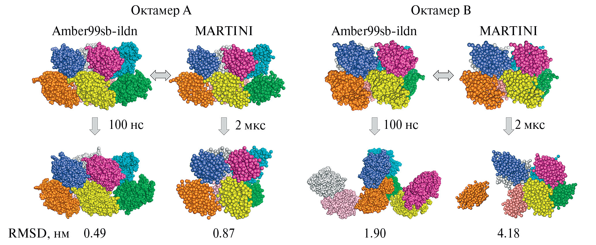 Однако из рис. 3 следует, что по всем оценкам (RMSF, RMSD, Rg) октамер А демонстрирует бóльшую стабильность по сравнению с октамером В в обоих силовых полях – Amber99sb-ildn и MARTINI, что также подтверждается изображениями структур октамеров в начале и в конце моделирования на рис. 2. При этом, несмотря на разные механизмы дестабилизации октамера В, для него согласованность зависимостей RMSF, RMSD и Rg в обоих полях немного выше.