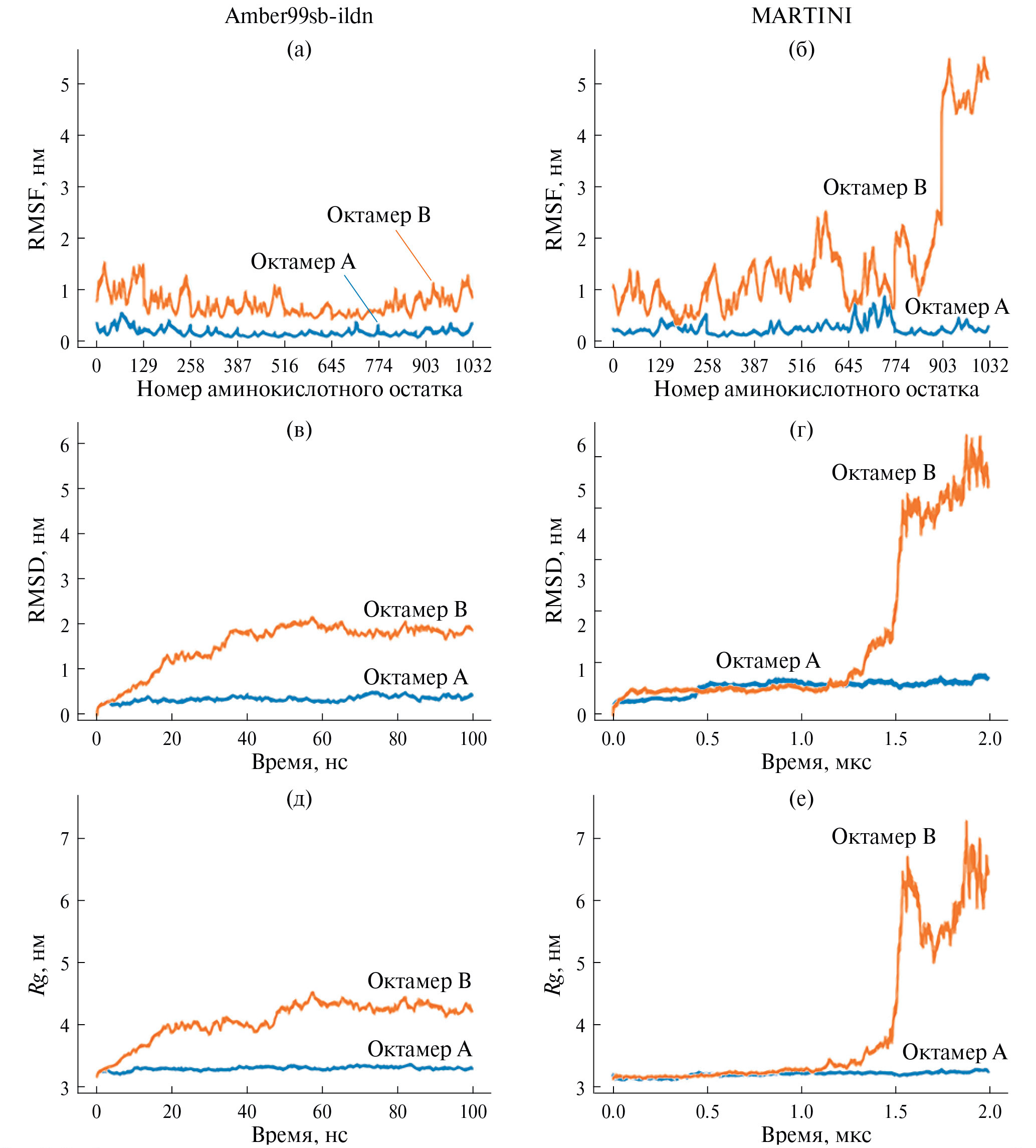 Рис. 3. Стабильность октамеров А и В в кристаллизационном растворе в ходе молекулярной динамики, смоделированной в разных силовых полях: “полноатомном” поле Amber99sb-ildn (слева) и крупнозернистом поле MARTINI (справа). Стабильность оценивалась с помощью характеристик RMSF (a, б), RMSD (в, г) и Rg (д, е). На всех графиках (а–е) октамер А стабильнее октамера В, что говорит о согласованности результатов моделирования в силовых полях Amber99sb-ildn и MARTINI.