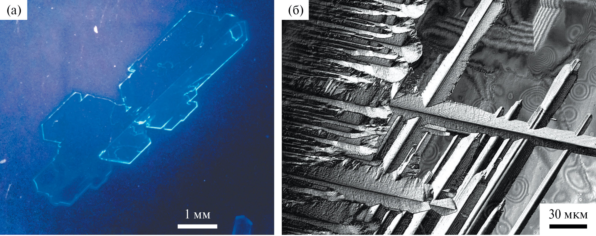 Бесцветные кристаллы TMS-4P-TMS в насыщенных спиртовых парах склонны к росту на границе раздела жидкость–воздух. В данных условиях в течение 5–14 сут формируются плоские монокристаллы длиной 5 и более миллиметров, толщина которых может превышать 300 мкм (рис. 2а, табл. 2). При УФ-освещении кристаллы флуоресцируют синим цветом (рис. 2а). Монокристаллы TMS-4P-TMS малых размеров имеет типичную форму – параллелограмм с внутренними углами ~79° и ~101° (рис. 2б). Поверхность развитой грани крупных кристаллов (рис. 2в) изобилует множеством макроступеней и дислокационных холмиков роста. В качестве примера на рис. 2г представлено конфокальное изображение четырехскатной дислокационной пирамиды.