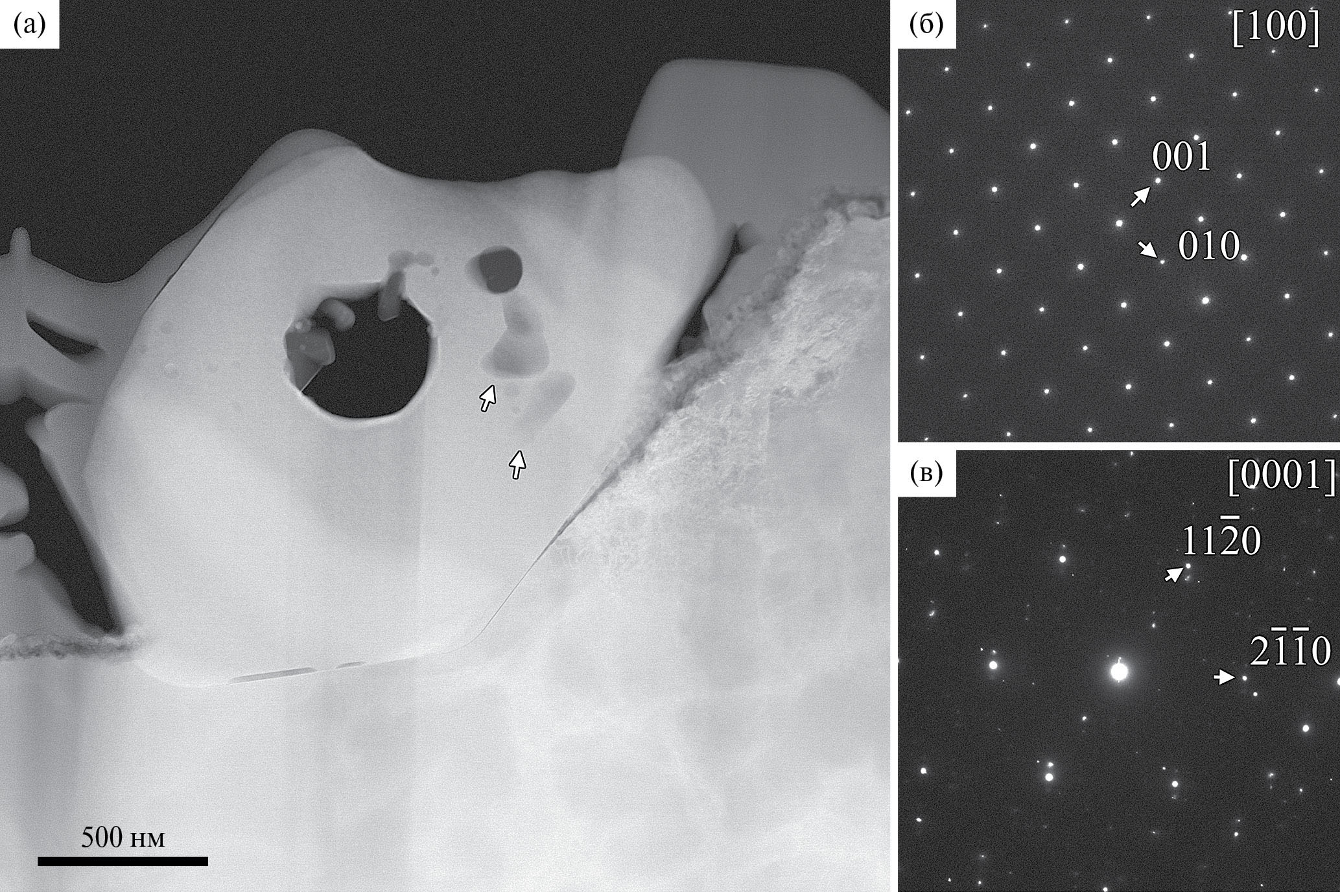 Рис. 4. Темнопольное ПРЭМ-изображение частицы HfO2 с включениями Al2O3, показанными стрелками (а); соответствующие электронограммы: б – HfO2, в – α-Al2O3.