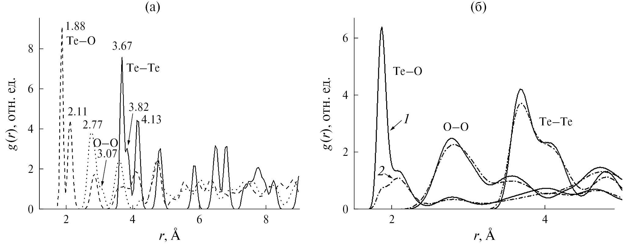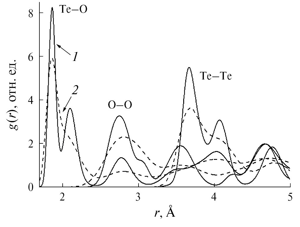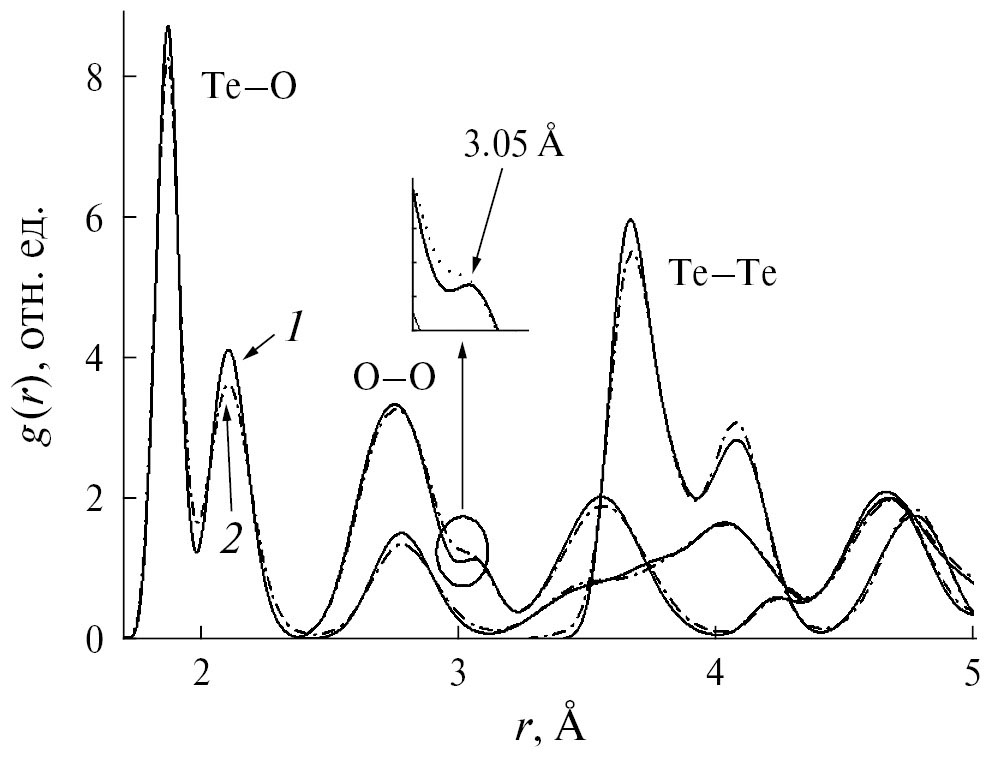 При повышении температуры ход g(r) качественно не изменяется, однако наблюдается “разупорядочение” кислородной подрешетки; наиболее заметный признак разупорядочения – “размытие” максимумов РПКФ для пар O–O и Те–О.