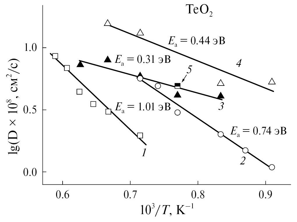 В [31, 32] были изучены спин-решеточная релаксация подрешетки теллура и временной отклик изменения электропроводности кристаллов парателлурита после скачкообразного изменения парциального давления кислорода в окружающей атмосфере. Полученные результаты позволили рассчитать коэффициент химической диффузии при 950 К – Dchem = (1 ± 0.3) × 10–5 см2/с. В этом случае наблюдается амбиполярная диффузия, обусловленная переносом электронных дырок и междоузельных анионов кислорода [31, 32]: