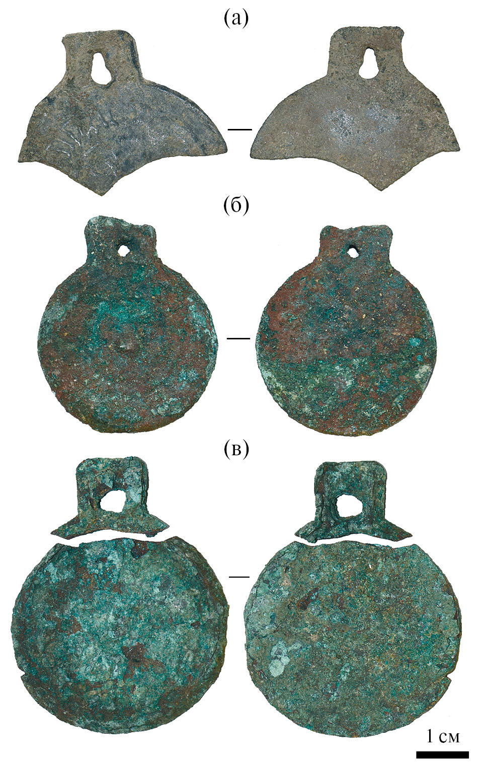 Рис. 1. Зеркала-подвески с территории Керченского полуострова: а – зеркало шифр З-1, б – зеркало шифр З-2, в – зеркало шифр З-3.