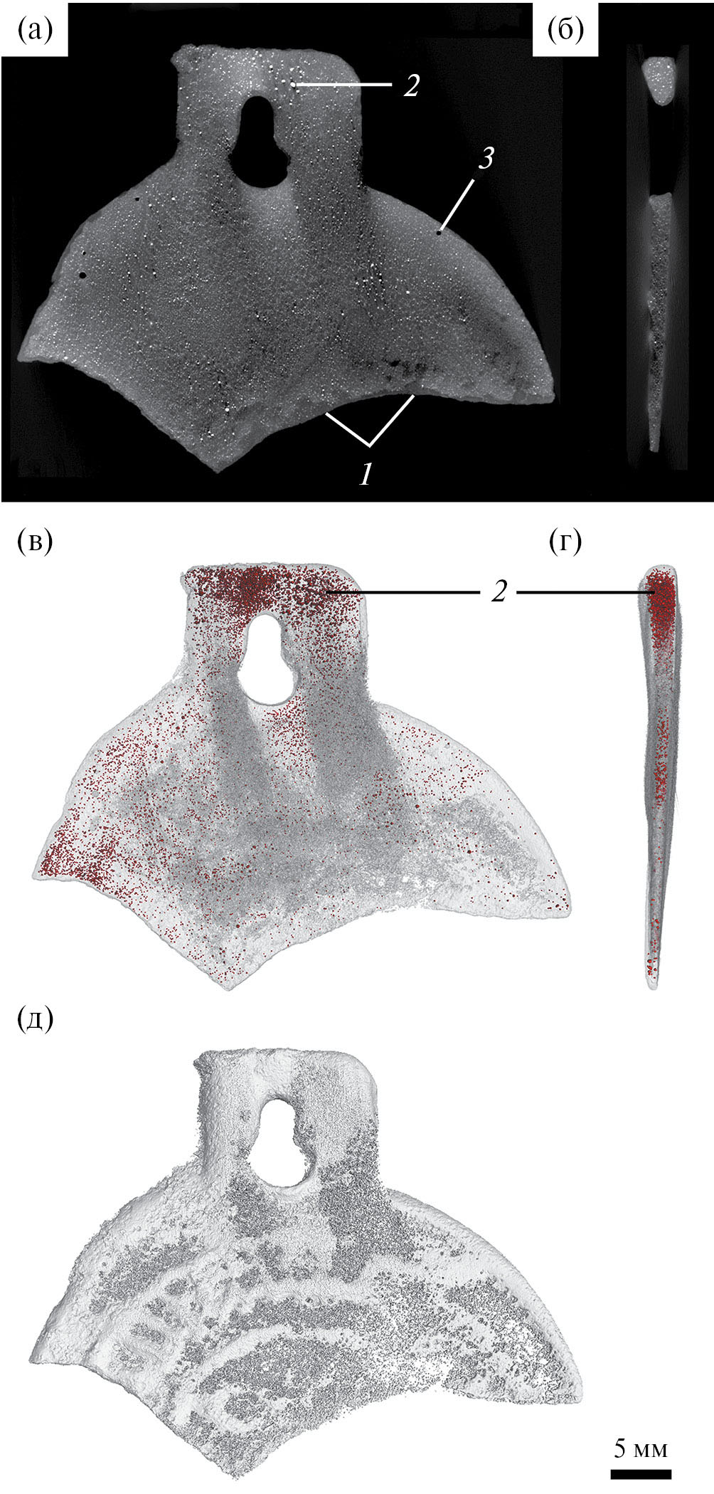 Рис. 2. Результаты рентгеновской томографии зеркала З-1: а, б – взаимно перпендикулярные томографические сечения, близкие к центру объекта, в, г – объемная модель расположения включений, д – модель орнаментированной поверхности зеркала; 1 – слой, подвергшийся коррозии, 2 – включения в металле, сильно поглощающие рентгеновское излучение, 3 – пустоты.